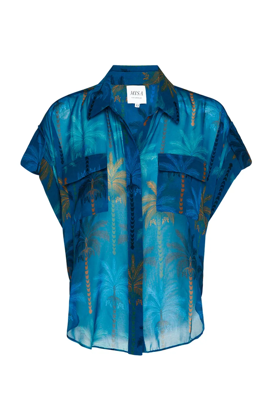 Erin is the epitome of effortless chic in a cobalt palms printed chiffon. This sheer, boxy silhouette features short rolled sleeves with epaulets. A covered front button placket and fold-over collar with double chest pockets is finished off with a curved hem. Wear this easy style as is or tie it in the front for a summer-ready look.