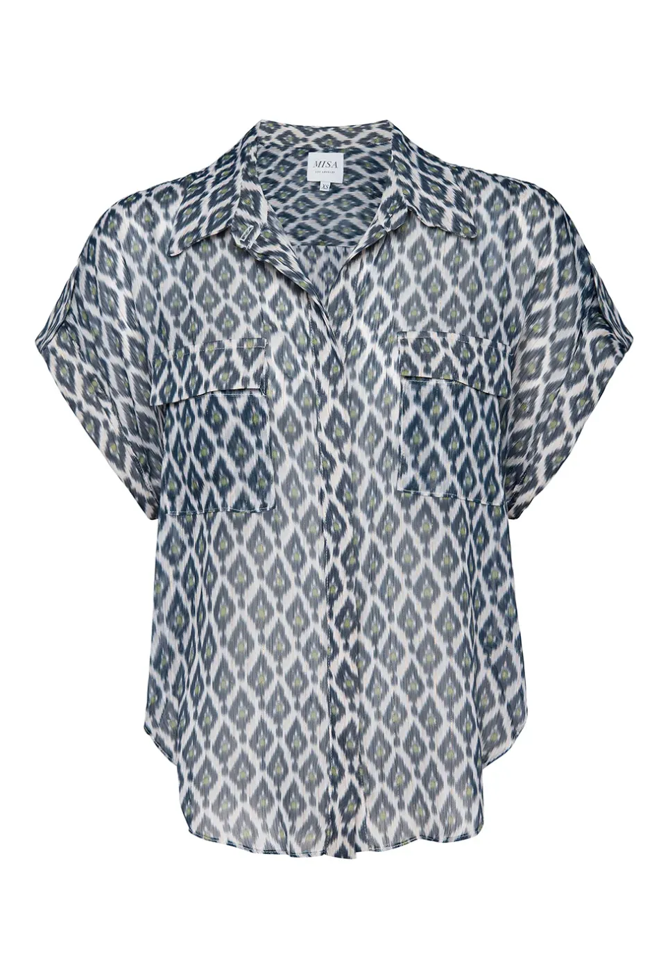 Erin is the epitome of effortless chic in beautiful peridot eyes print with lurex details throughout. This semi-sheet boxy silhouette features short rolled sleeves with epaulets. A covered front button placket and fold-over collar with double chest pockets is finished off with a curved hem. Pair with your favorite pair of jeans or the coordinating Freda pant for the perfect set.