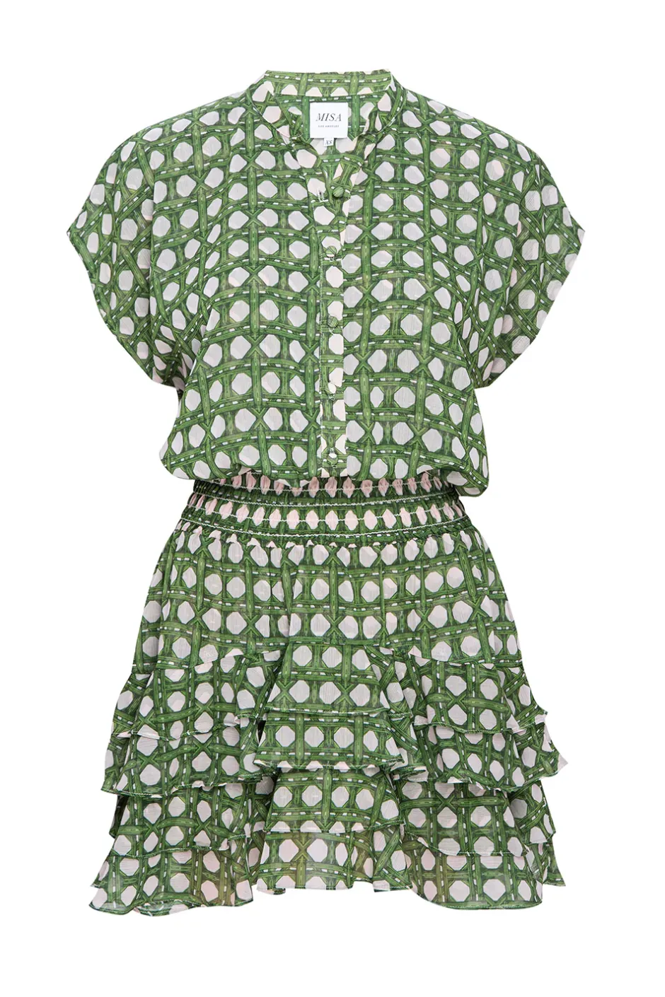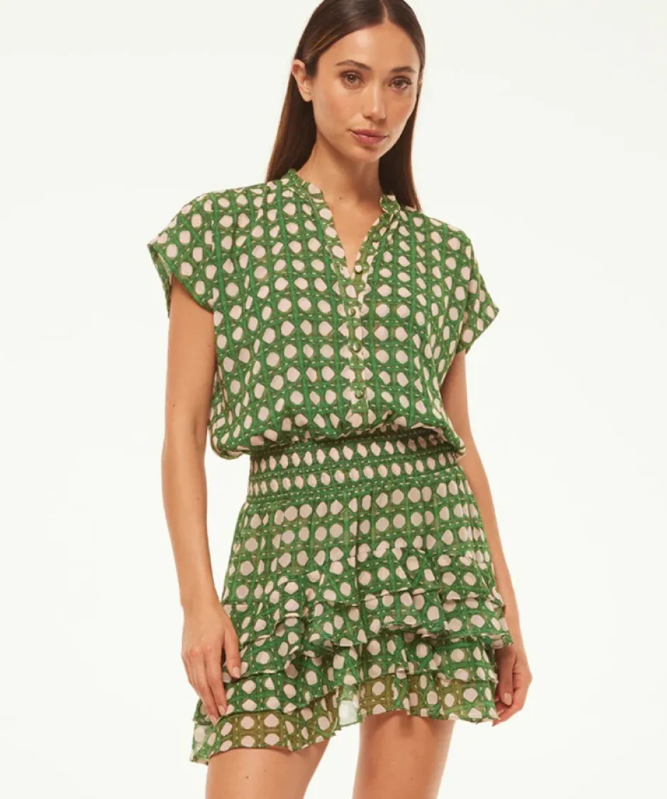 An effortless and versatile mini silhouette cut from a green and beige rattan print chiffon. Featuring a double-lined self-covered button-down bodice, smocked elastic waistband and layers of asymmetric tiered ruffles to finish the skirt. This best-selling style is flattering and versatile.