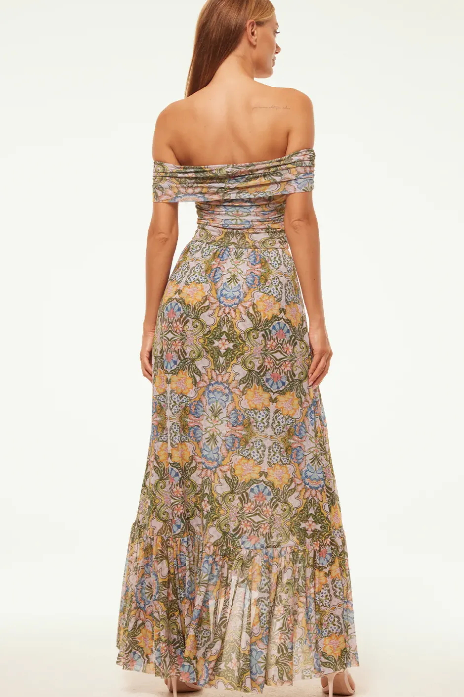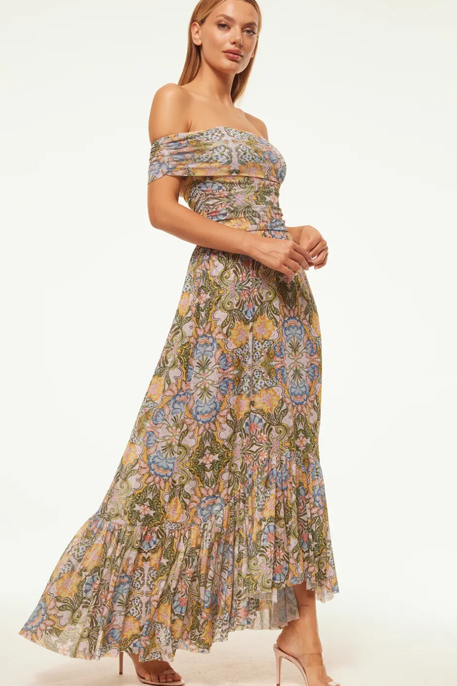 Mesh please! Our all new Fiorella maxi dress is the perfect many moment silhouette cut from a gorgeous Dolce Vita Kaleidoscope printed mesh that transports you to Italy. A fitted bodice features off-the-shoulder short sleeves. The slightly asymmetrical skirt is finished with a wide ruffle hem. Turn heads in our new favorite silhouette.