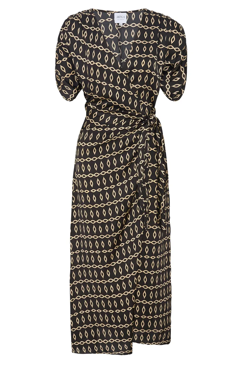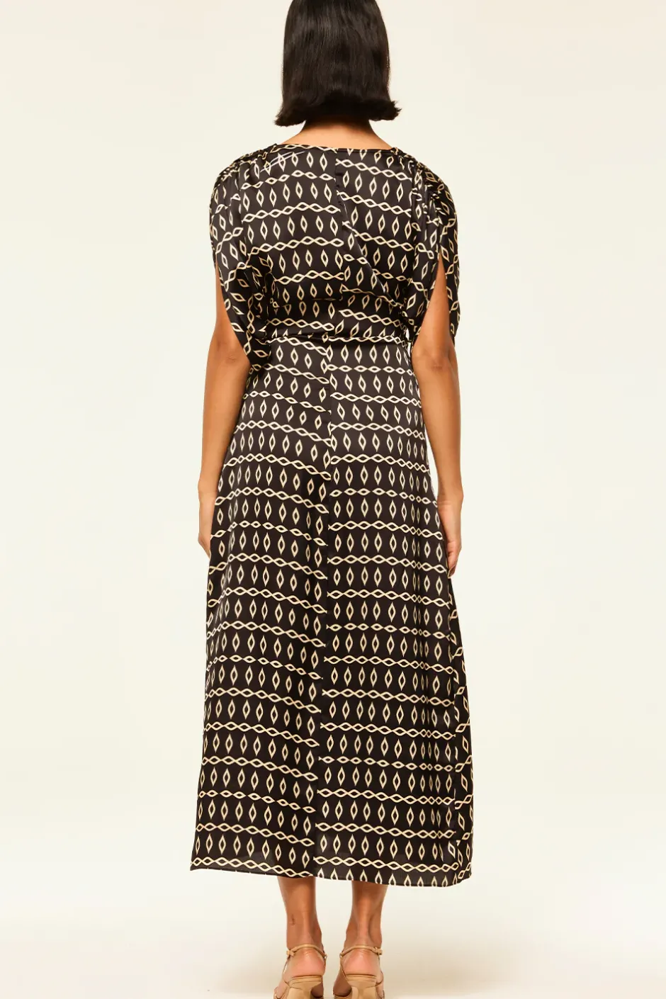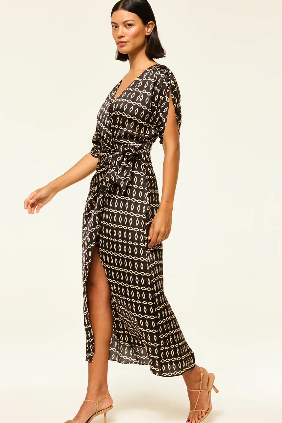 Our newest Francesca dress is an effortless midi wrap dress cut from a timeless Go West Geo printed satin on black ground. Featuring an adjustable tie waist, v-neckline, short sleeves and ruched shoulder details. Style with boots or a strappy heel depending on the occasion.