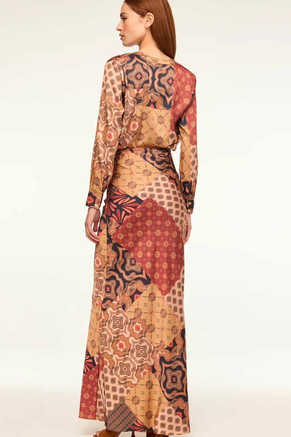 Our Frankie top is a collarless easy button-front blouse cut from our Surreal Patchwork printed satin. Long sleeves with double-button cuffs. Wear with the coordinating Sierra skirt or dress down with a pair of your favorite denim.