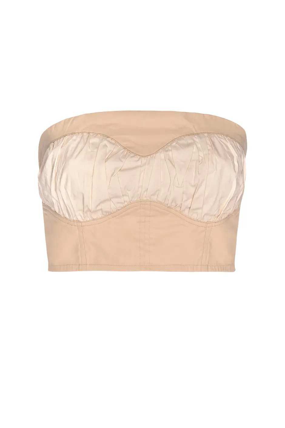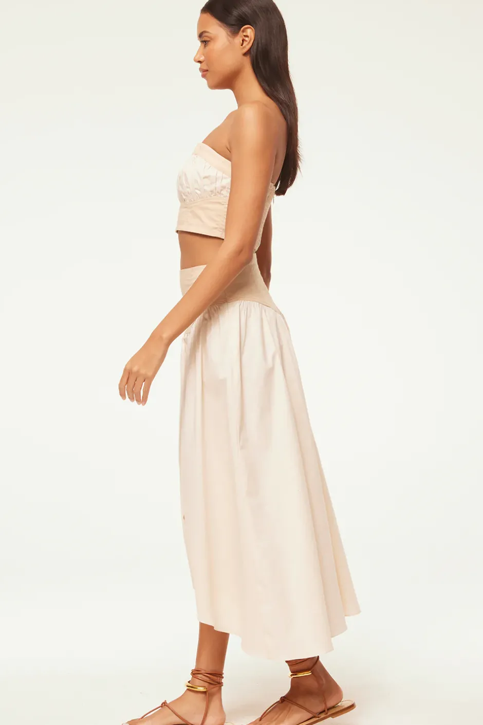 Golnaz is a simple and chic new strapless bandeau cut in a breezy ivory and beige contrast cotton poplin. The bust features a gathered detail and the back is fully smocked with a zip closure. Pair with the coordinating Ramez skirt for a timeless summer set.