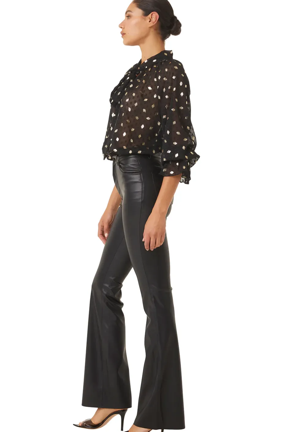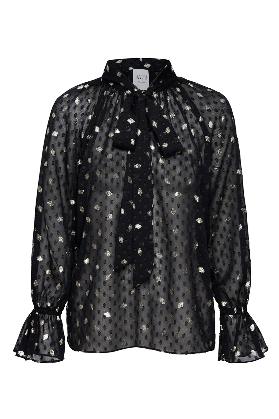 Statement-making chic, the Gracie top is cut from a semi-sheer black chiffon with dotted metallic diamond print. Long sleeves with a ruffle cuff and a high neckline features a neck-tie that can be worn loose and undone for a laid back look or tied in a bow. Pair with denim half-tucked for an effortless look or with our satin Filippa pant.