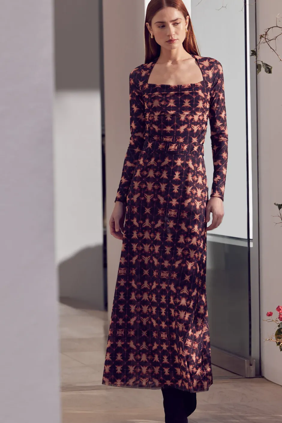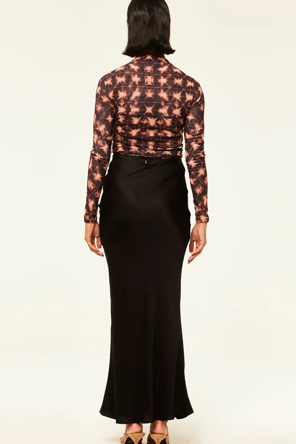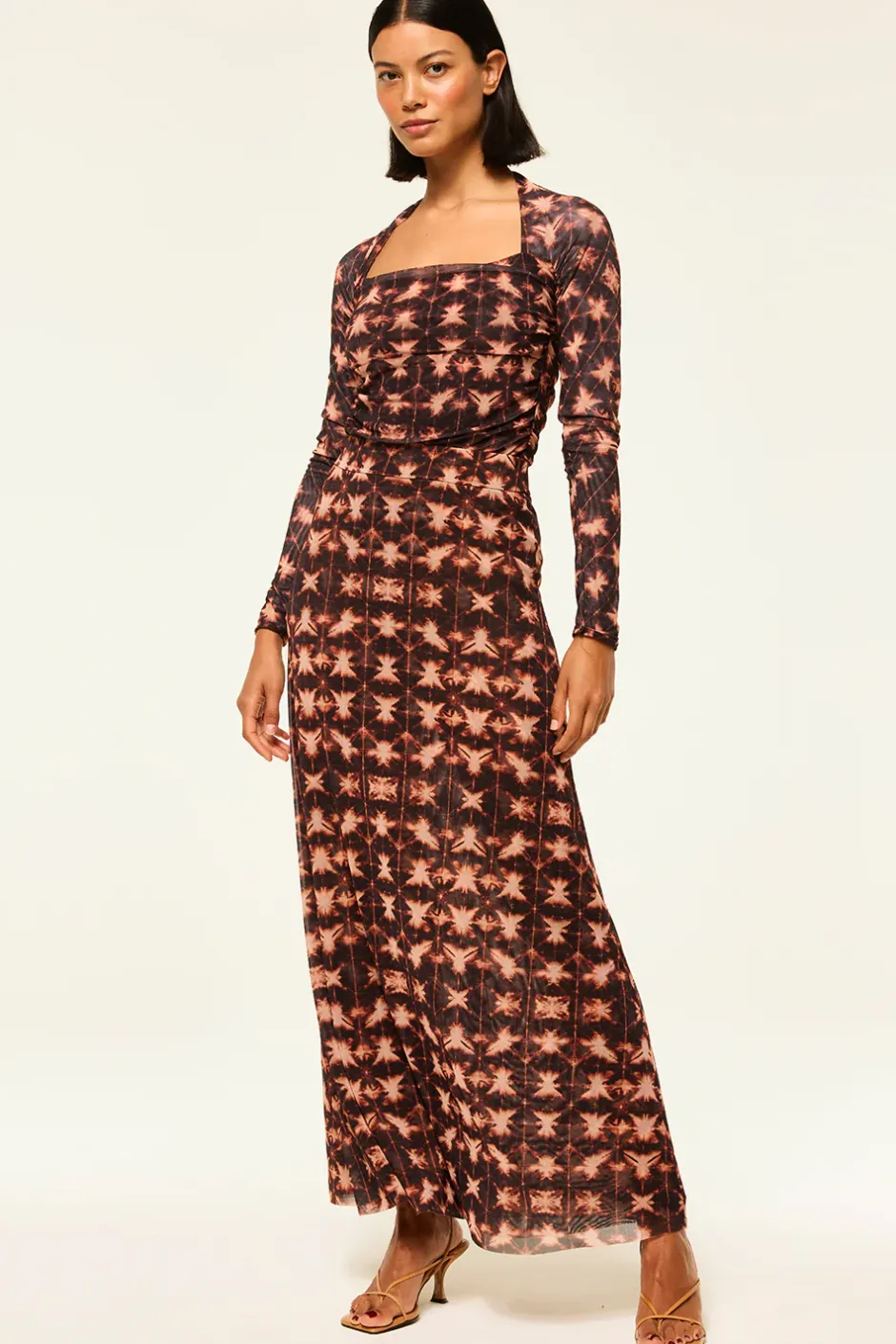 Our newest Hayworth bodysuit is back for fall in a gorgeous Angel Glow tie-dye print. Long sleeves and a flattering square neckline show off your collarbone and ruched stretch mesh hugs and flatters your curves. A snap-button bottom closure and thong back. Pair with your favorite pair of jeans or with our Sierra skirt in black. For a standout look wear with the coordinating Ekat skirt.