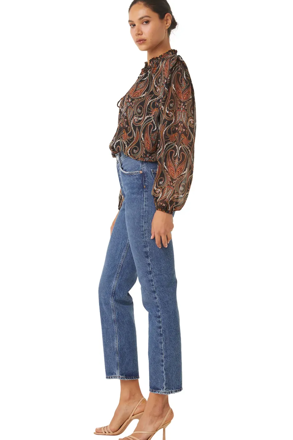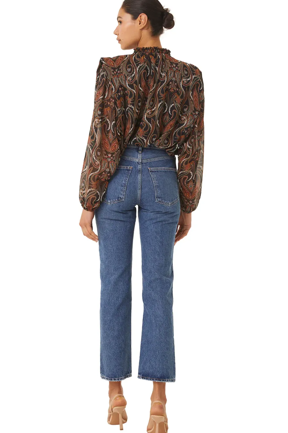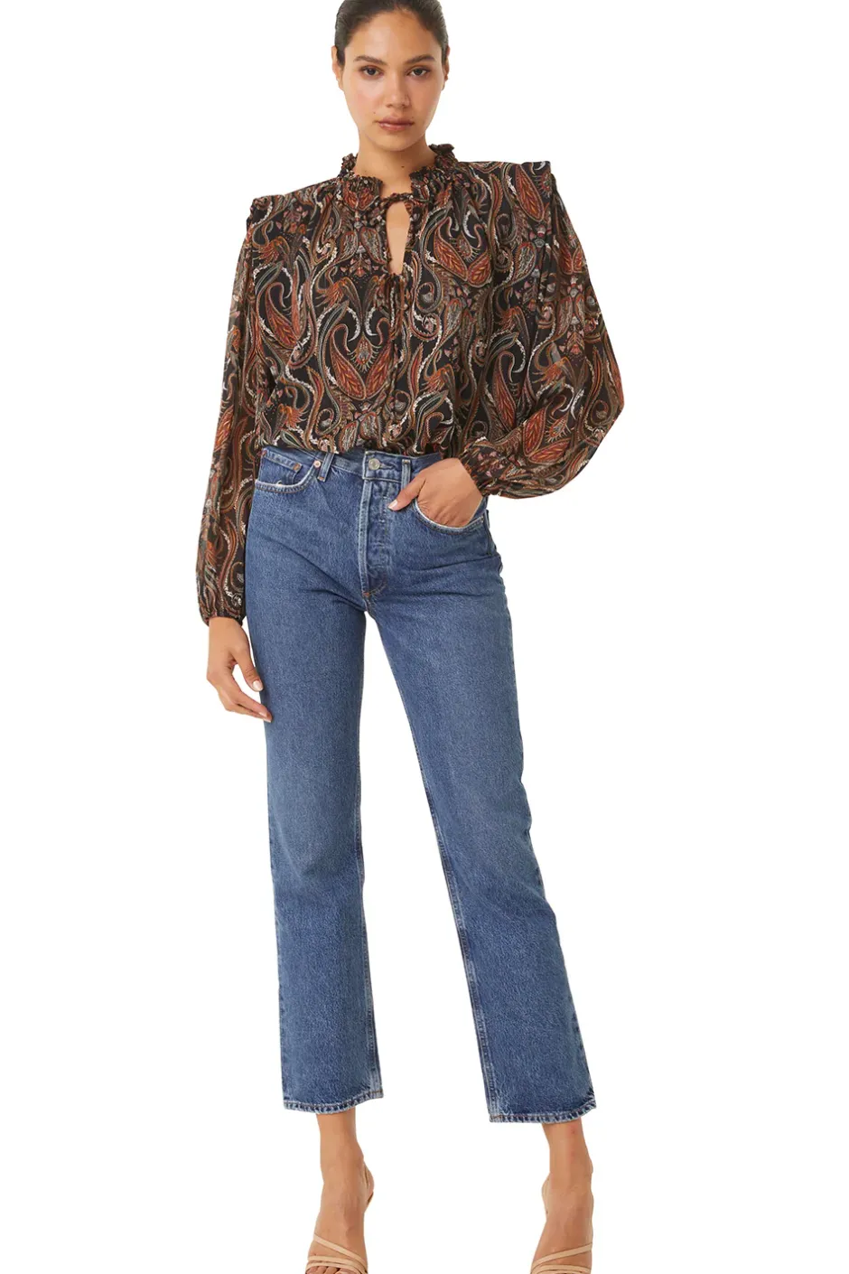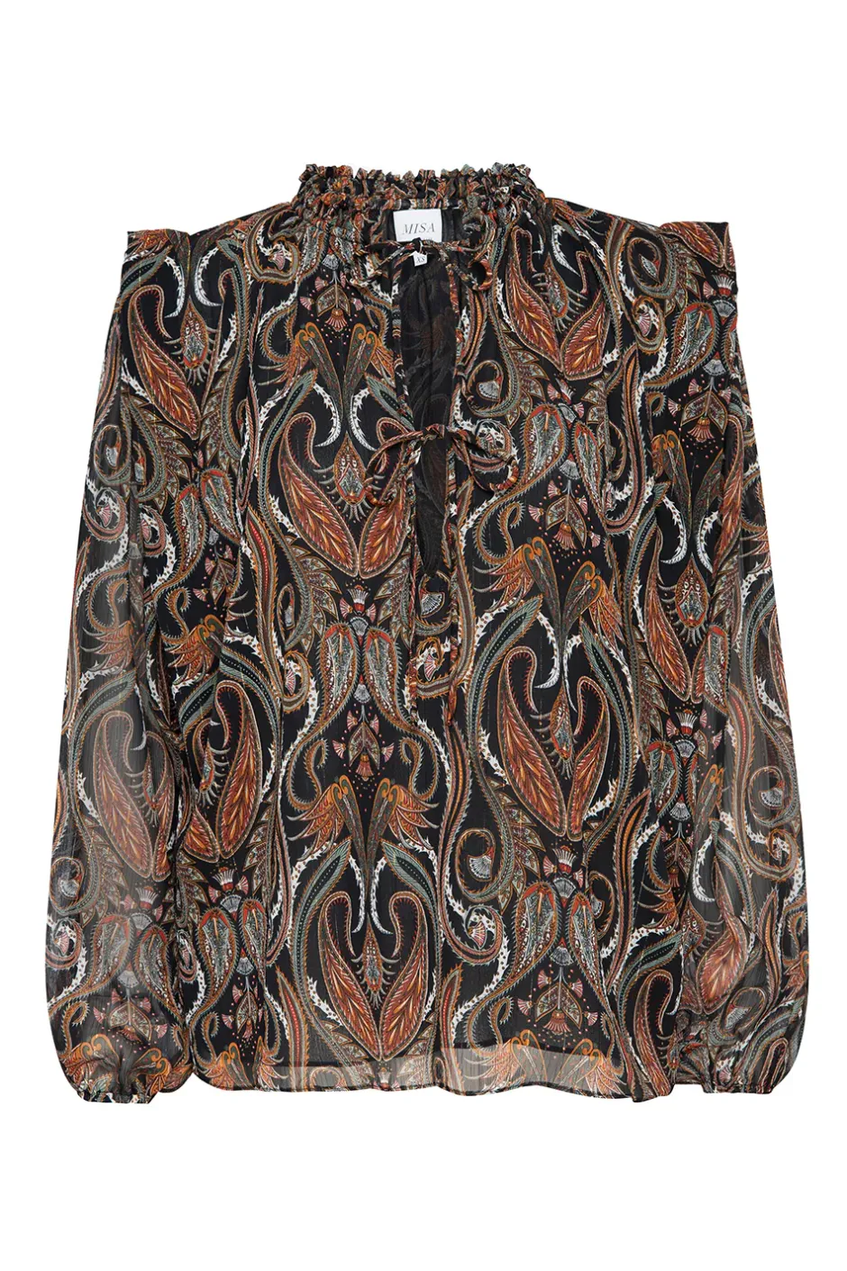 Helena is a beautiful chiffon blouse cut from a sparkling lurex paisley print. A split neckline with ties and a ruffle detail at the collar. Long puff sleeves lead into cinched cuffs. A ruffle stand detail at the shoulder gives a structured appearance. Our new favorite top pairs perfectly with jeans or dress up with our satin Filippa pant.