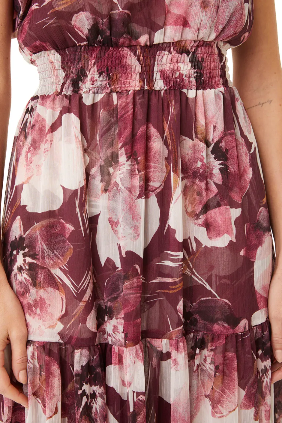 Ilaria is a gorgeous event-ready silhouette cut from a beautiful Flora Tropical print chiffon. This tiered one-shoulder maxi silhouette features a dramatic structured ruffle detail at the shoulder. A covered elasticized waist is comfortable and figure-flattering. Pair with a barely there heel and sleek bun for elevated elegance.
