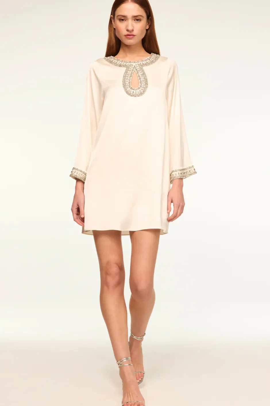Stun all holiday season in our new Ivy mini dress cut from a silky ivory satin finished with crystal-embellished trim. This mod-inspired style features a round neckline and front teardrop cutout with long flared sleeves finished with the same crystals and an optional self-tie belt. This a-line silhouette is double lined with a back hook and eye closure. Wear with shimmering heels for your next holiday soirée.