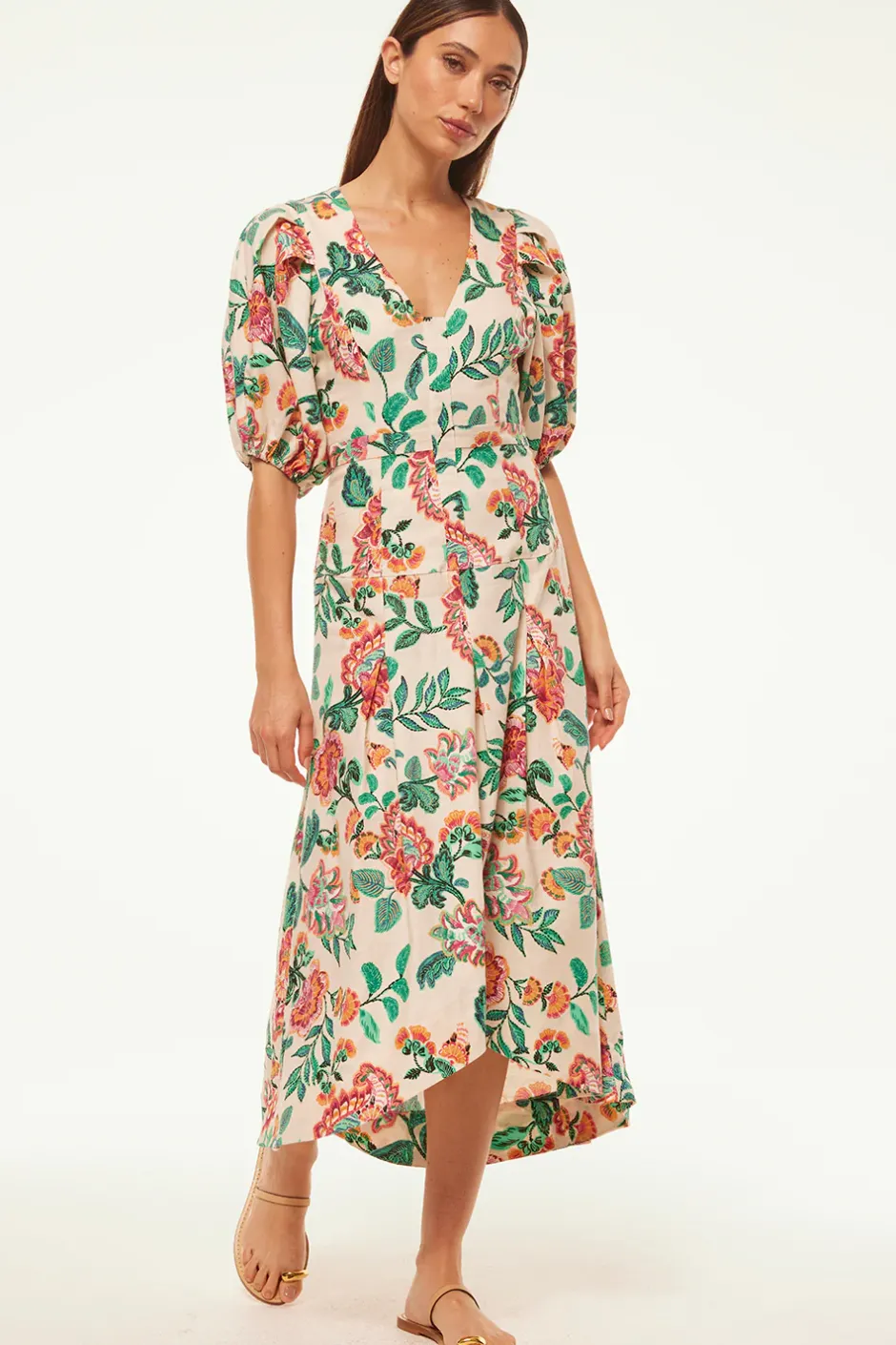 Jamila is an ultra-feminine midi dress cut from a gorgeous floral linen fabric perfect for Spring and beyond. Featuring short puffed sleeves that are ruched at the shoulders with elastic cuffs. A v-neckline and fitted bodice leads into an asymmetrical skirt. Hidden side zip closure. Dress up with strappy heels or pair with minimalist sandals for the perfect weekend look.