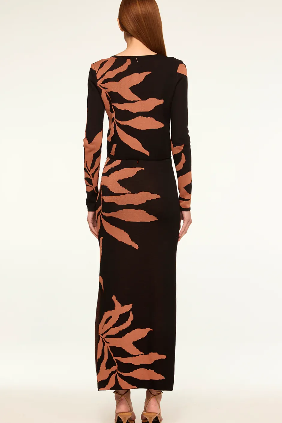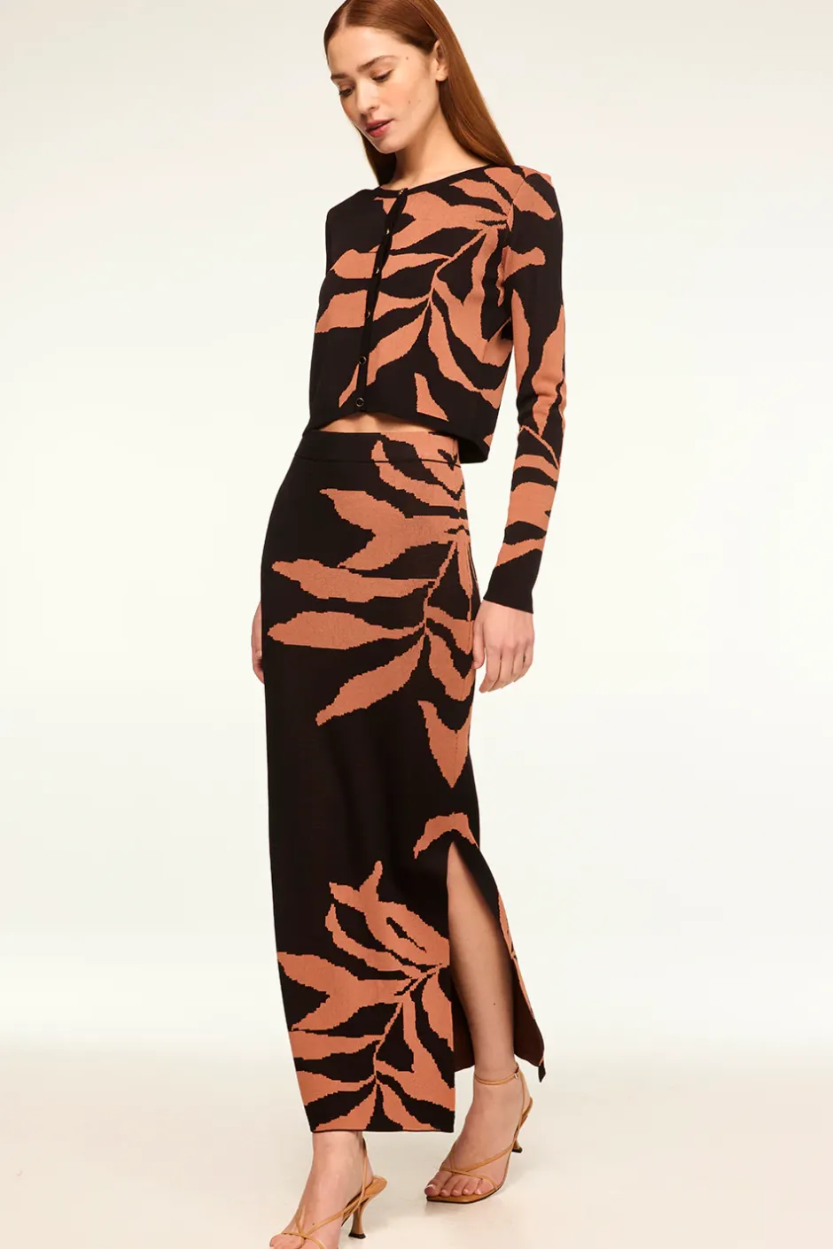 Our Joana cardigan is a beautiful jacquard knit in our Fernal Glow print. A fitted, slightly cropped silhouette fully buttons at the front and is finished with tonal, black enamel buttons. Wear with jeans or pair with the matching Fira skirt.