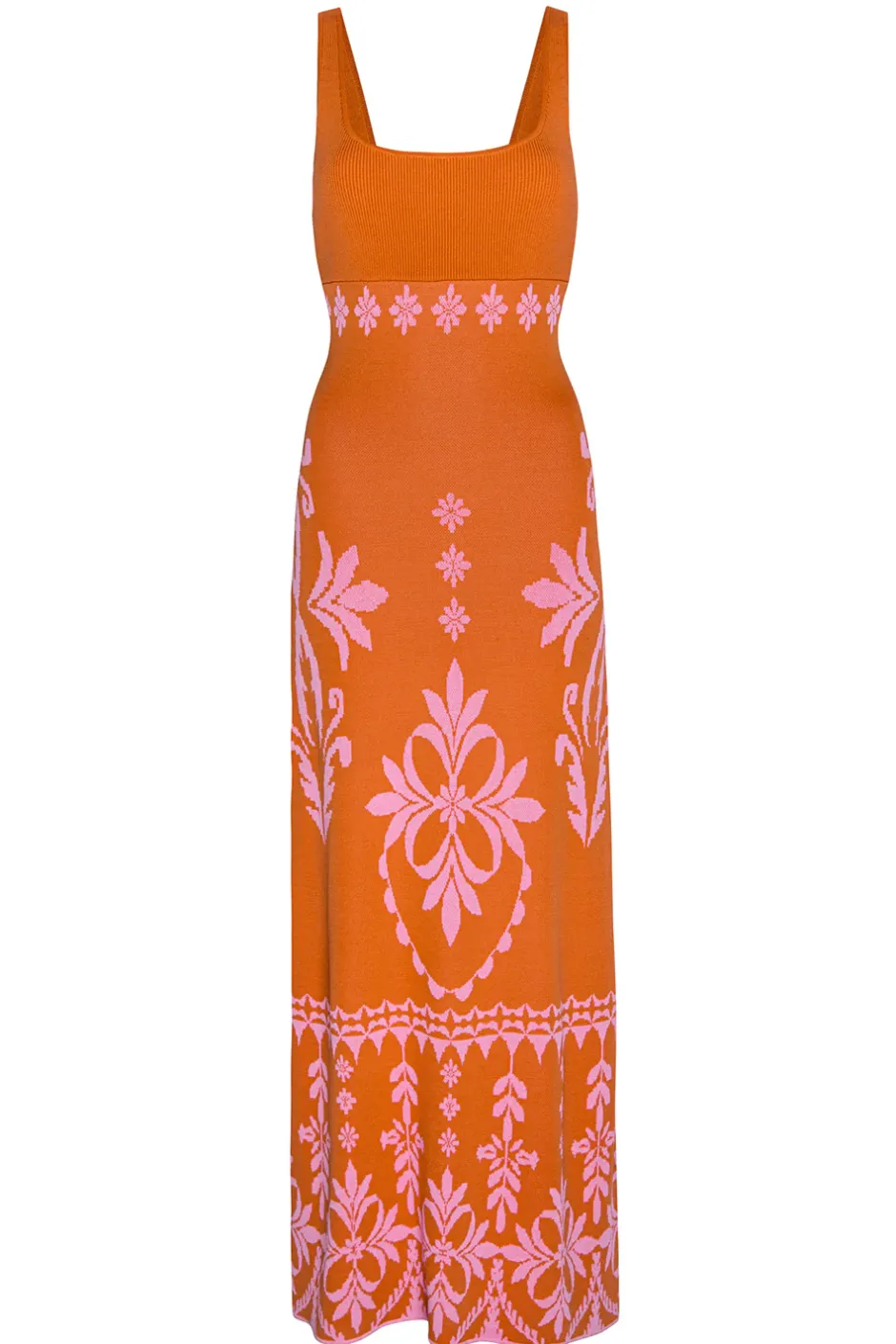 Our Kalil knit dress is a maxi length fitted silhouette in knit jacquard with contrast pink floral graphics on papaya ground. Sleeveless with thin straps and a square neckline and back. Pull-on style with a ribbed bodice.