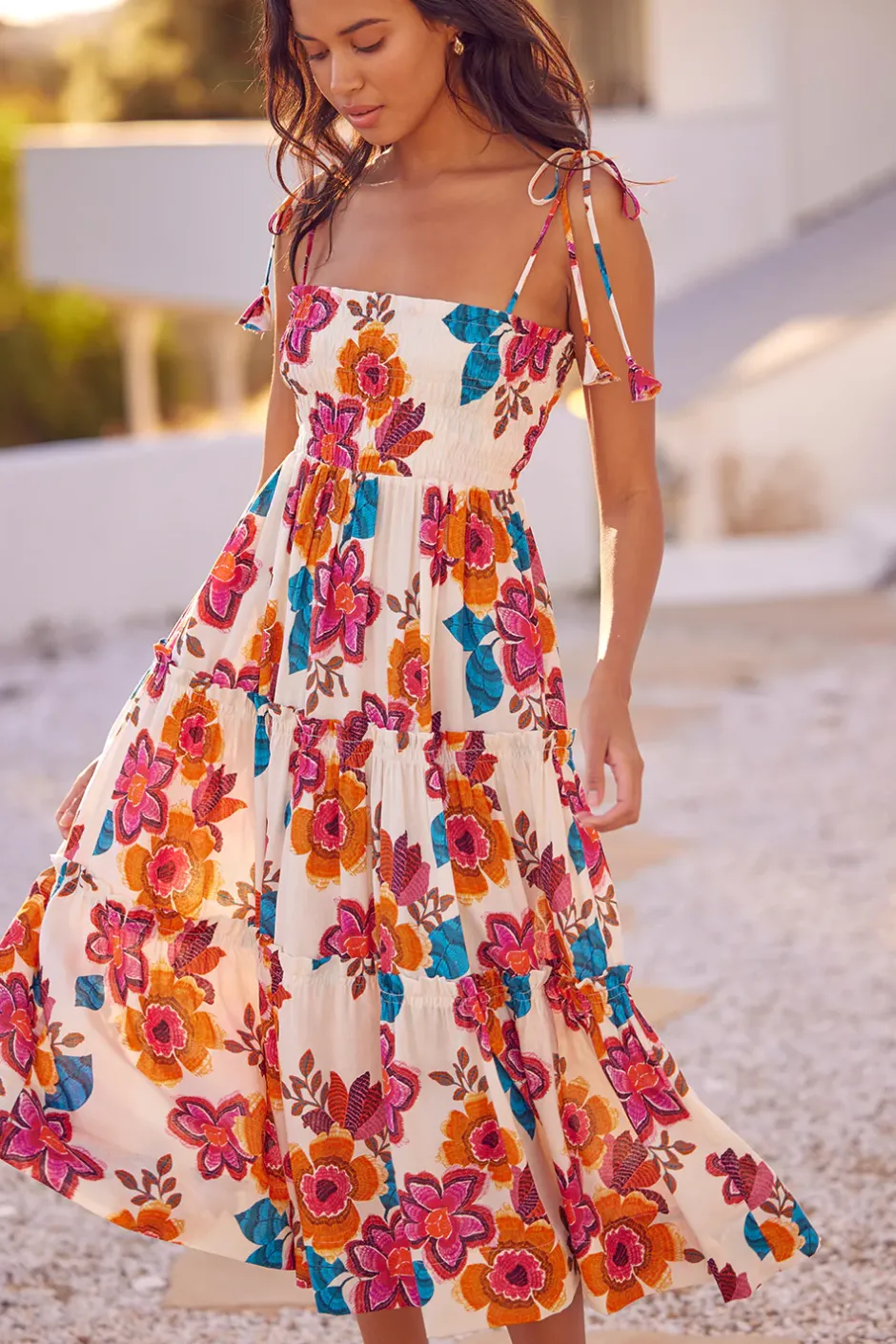 Our new Kamina dress is an easy Summer silhouette cut from a vibrant Flora Marbella print linen blend. A fitted smocked bodice with tie petal tassel spaghetti straps leads into a midi length tiered skirt with side slit pockets. This lovely day dress pairs perfectly with everything from sandals to ballet flats.