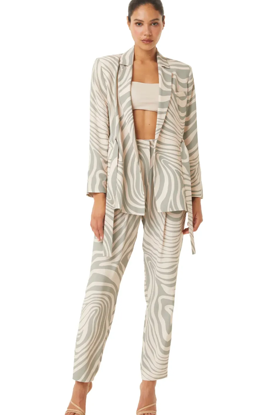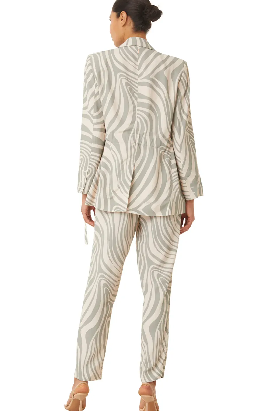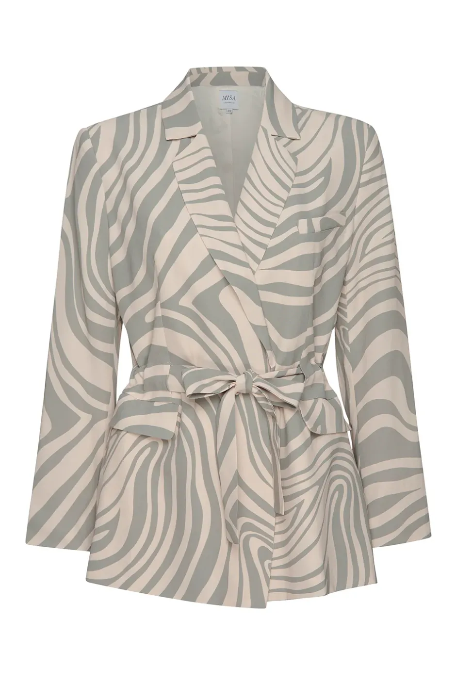The Kelsey is a lightweight blazer jacket designed to flatter your silhouette with a customizable fit in an easy abstract zebra printed viscose fabric. Light shoulder pads give it a more structured fit at the shoulders. Featuring a covered adjustable belt. Cinch it for a defined waist, or leave it open for a relaxed look. Fold over collar, open front, single slit chest pocket and flap front hip pockets. Back vent detail. Pair it with the coordinating Perry pant and Yvan top for a sophisticated set that is truly timeless.
