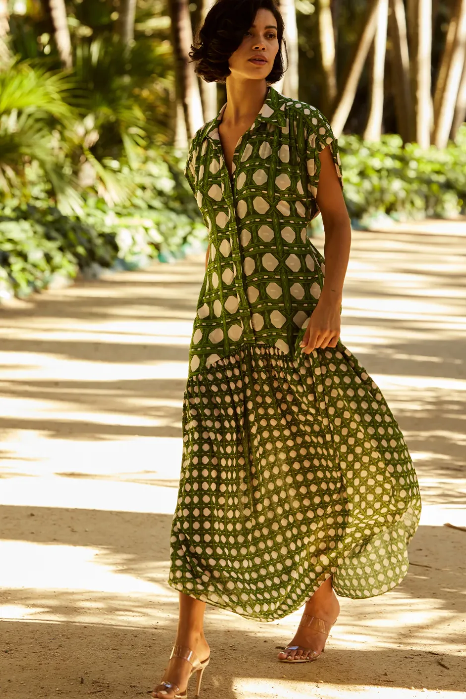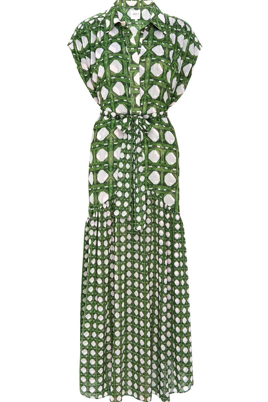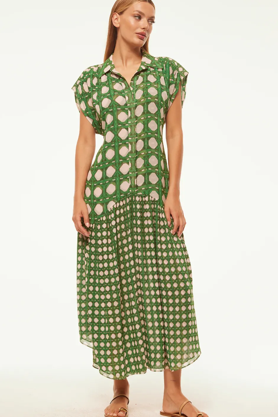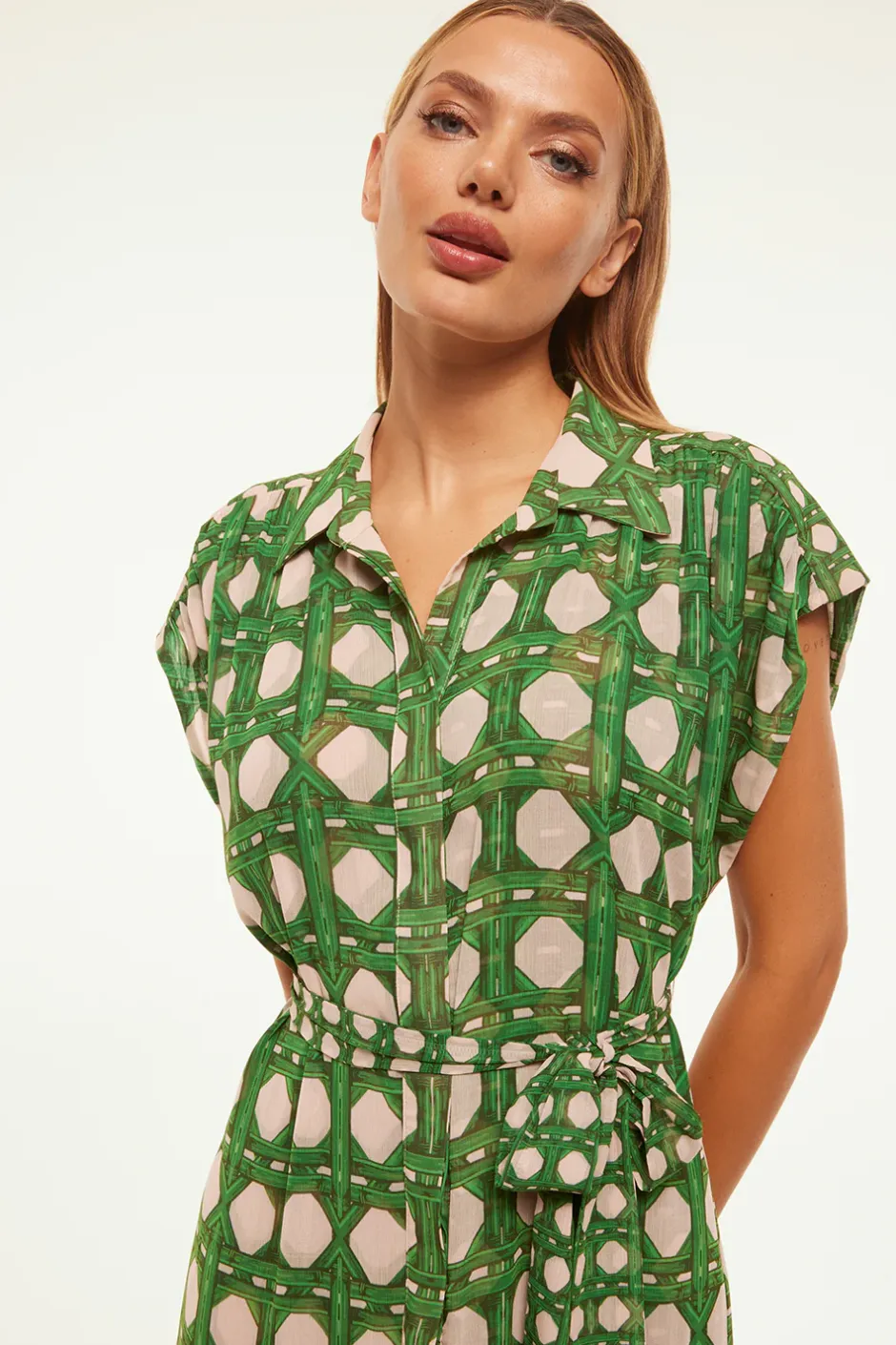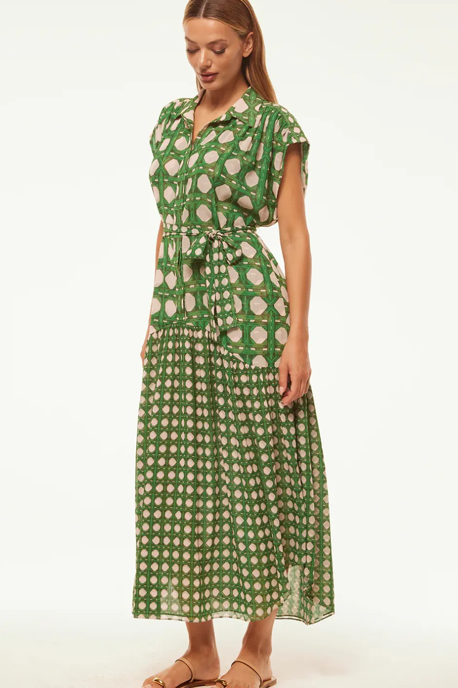 Our Laura shirtdress is updated for Spring in a rattan tile print. A spread collar and covered button front feature short sleeves with a ruched shoulder detail. A dropped waist and removable tie belt finishes off this ankle-grazing a-line silhouette that can be dressed up or down depending on the occasion.