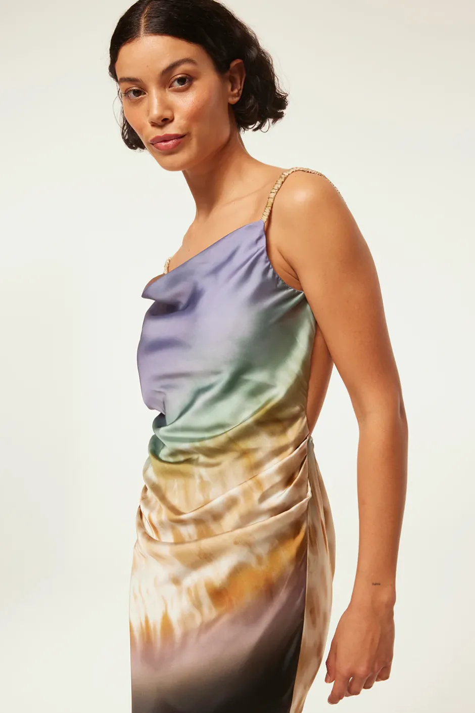 Our Livia dress is a stunning new silhouette cut from a Cerulean Ombré printed satin. This ankle-grazing style features a draped cowl neckline and scrunched elastic spaghetti straps with a low open back. Gathering at the waist provides a flattering fit that leads into a straight skirt with side slit.