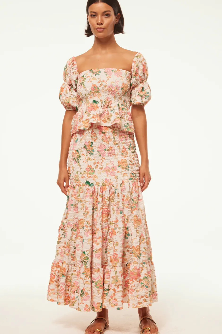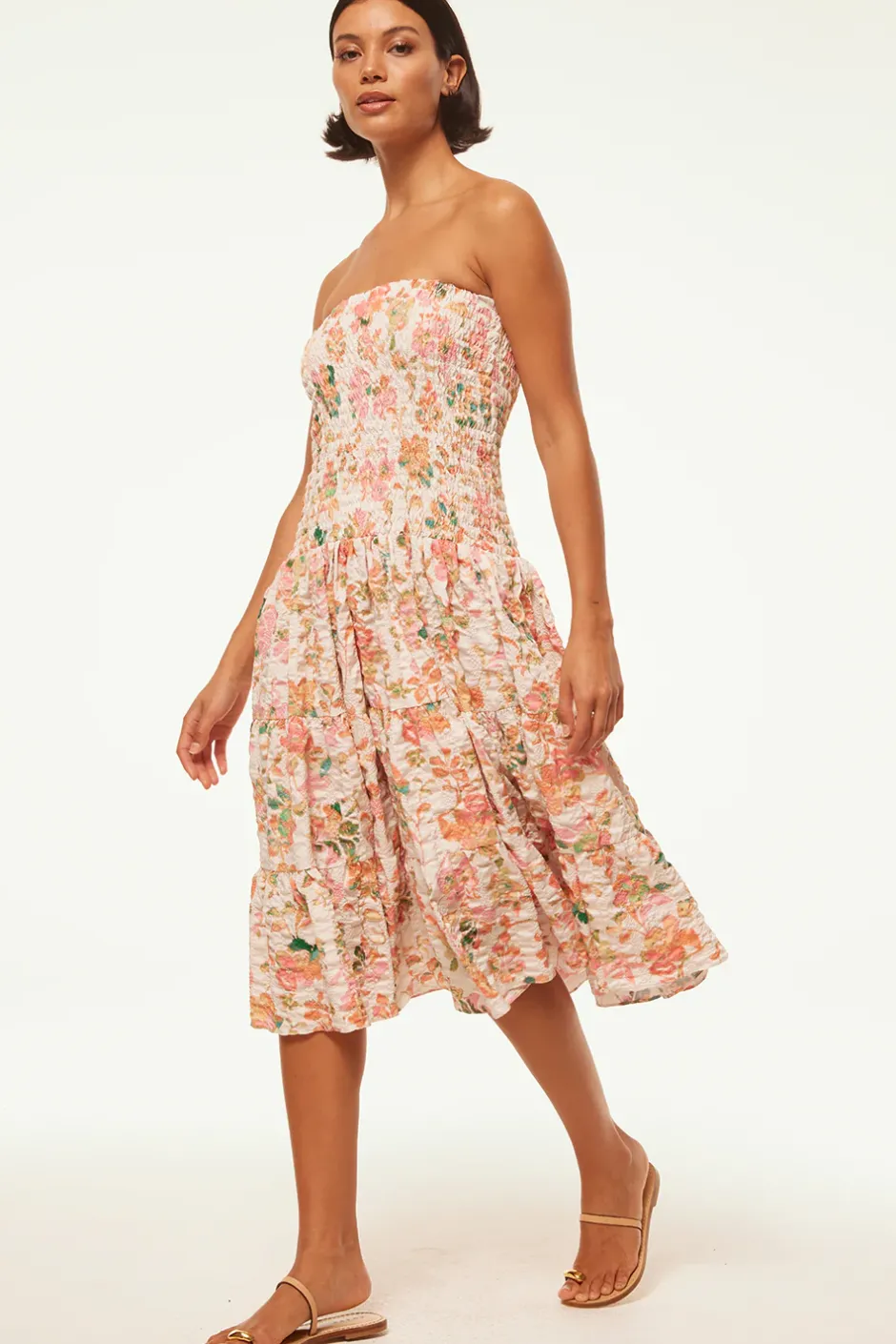Our new Lola Convertible is an effortless addition to your wardrobe. Featuring a wide elastic shirred waist, this versatile piece cut in a persimmon floral crinkle fabrication can be worn as a chic strapless dress or as a skirt paired with our coordinating Vida top.