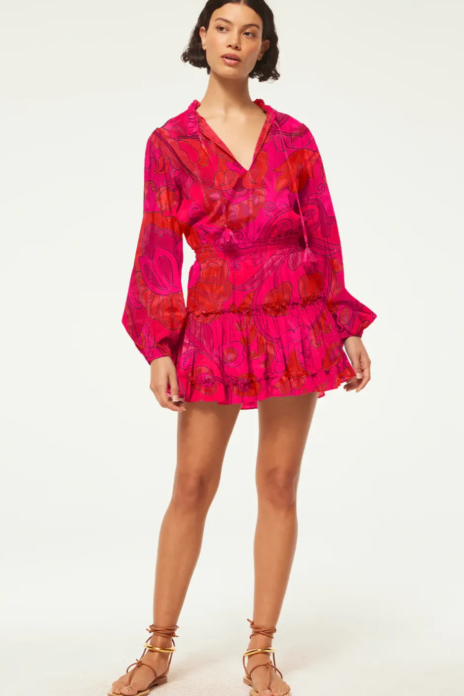 A classic MISA style handcrafted from a vibrant fuchsia Flora Corsica printed satin. Featuring a split neck opening with our signature petal string ties, this playful long sleeve mini dress features a smocked elastic waist and tiered mini skirt.
