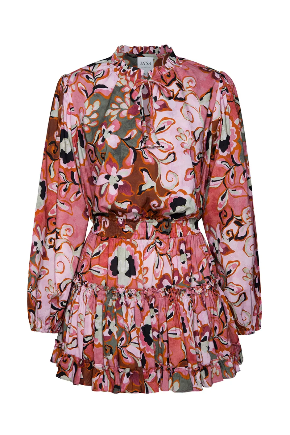 Lorena is a classic style handcrafted from an effortless Resort Batik print cotton blend. An elastic waistband leads into a tiered ruffle trimmed mini skirt. Featuring a split neck opening with our signature petal string ties, this playful long sleeve mini dress is the perfect everyday pack and go piece.