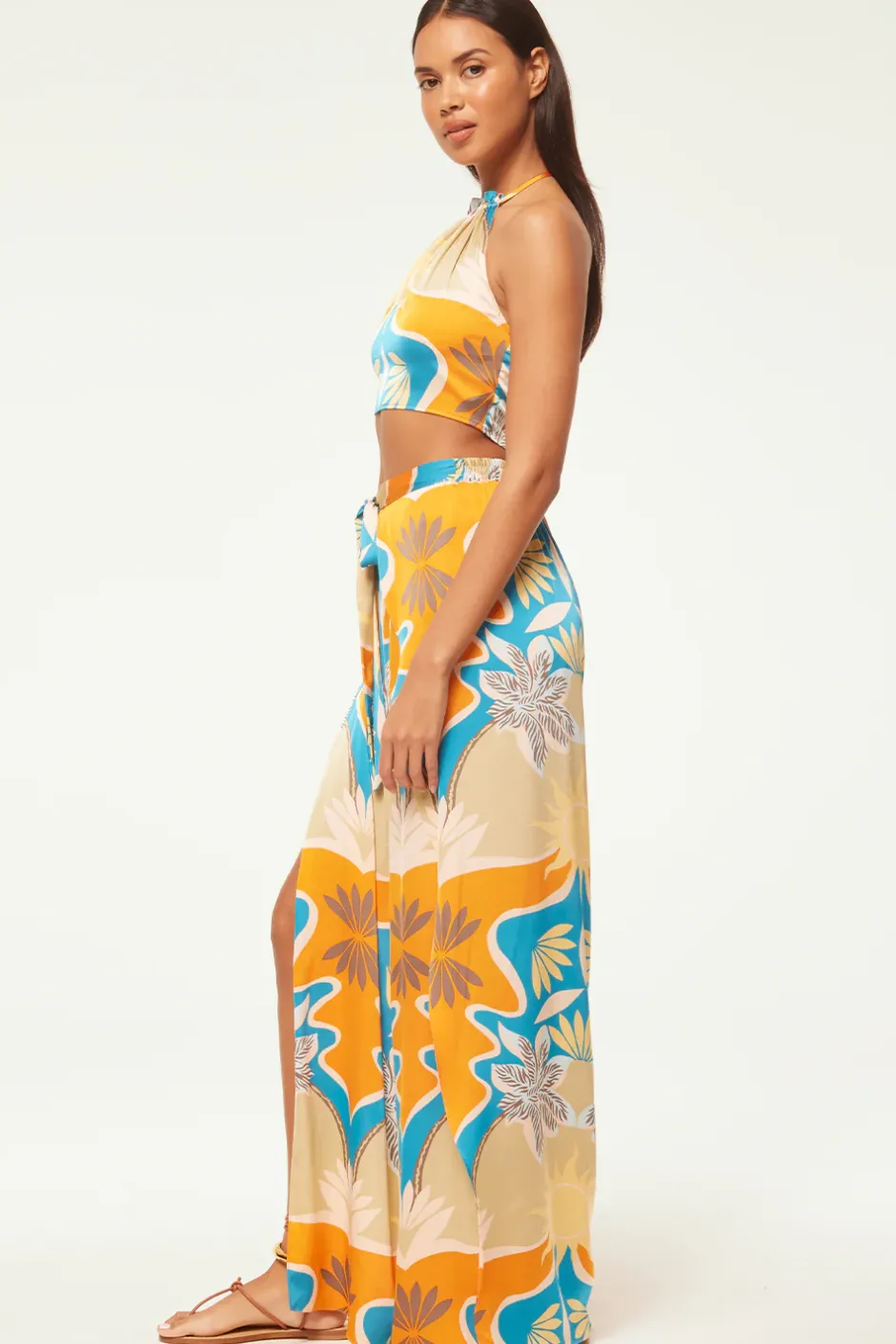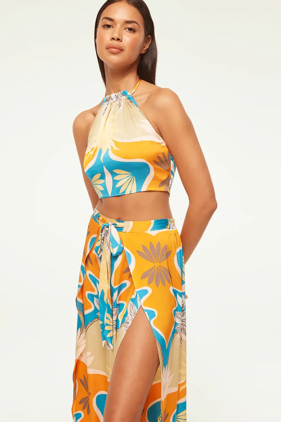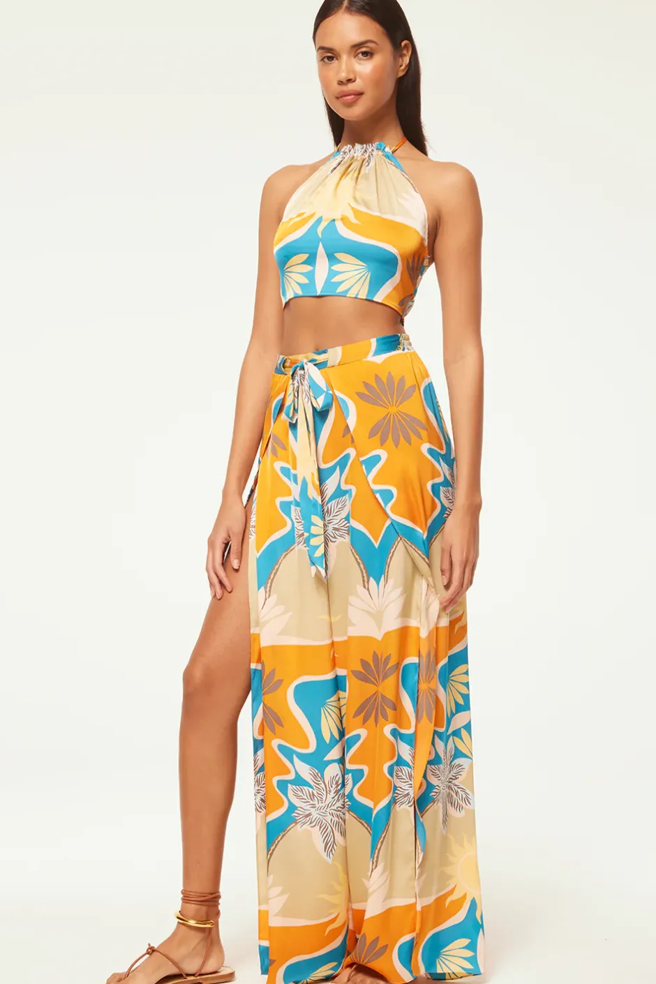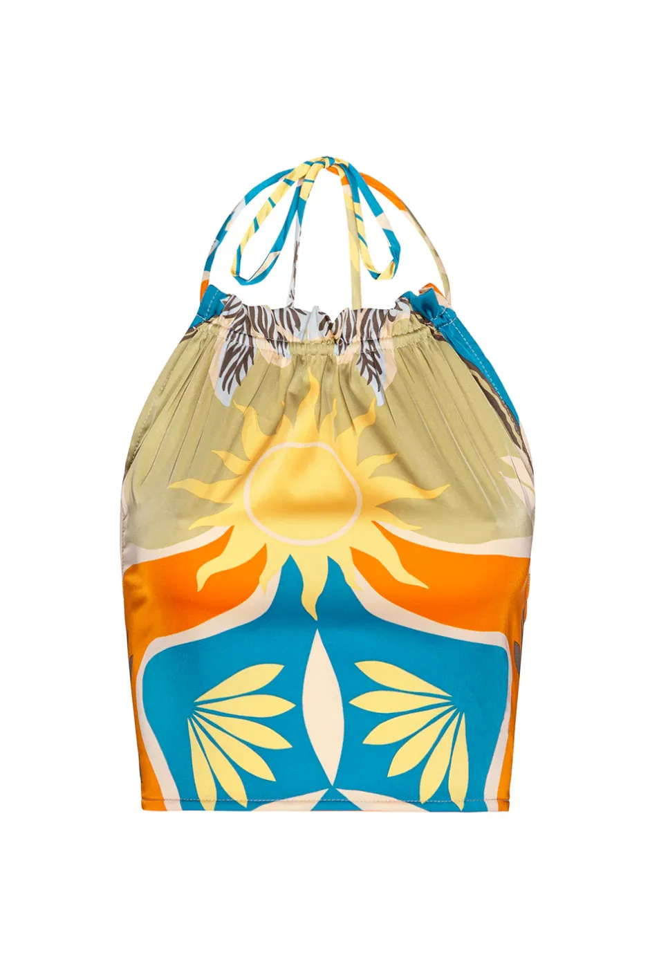 The Luan crop top is a Summer standout, cut from our stunning Bain de Soleil printed satin. A halter neckline is finished with our signature petal tassel ties. A smocked back provides a comfortable and flattering fit. Pair with the coordinating Kanna pant for a getaway set sure to stun.