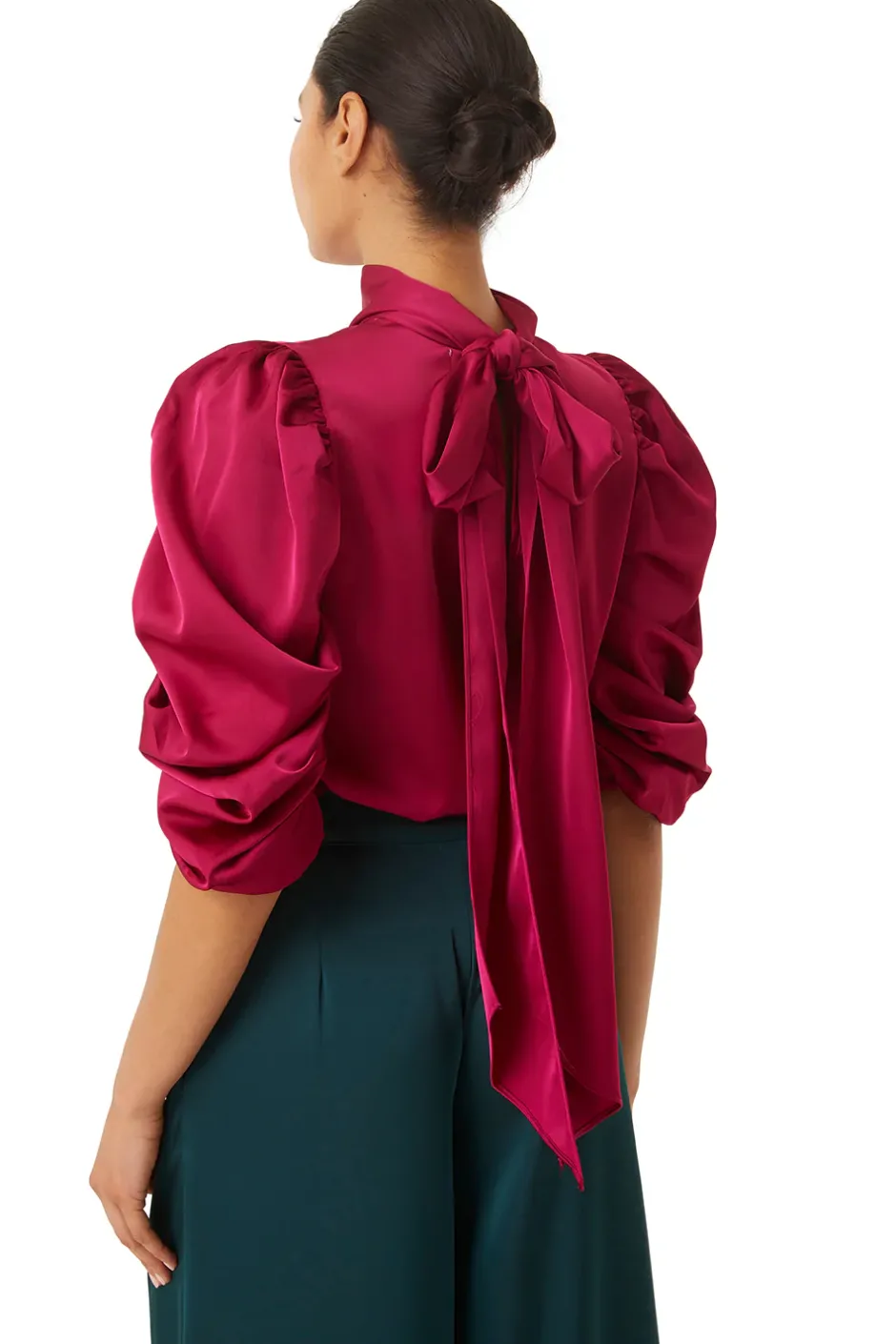 Our new Luella top is soon to be a wardrobe staple. Cut from the silkiest fuchsia satin, it features a sophisticated high mock neck finished off with a tie closure. Gathered at the shoulder and featuring three-quarter ruched blouson sleeves. Pair this top with the coordinating Filippa pant for a chic set or dress down with a pair of jeans.