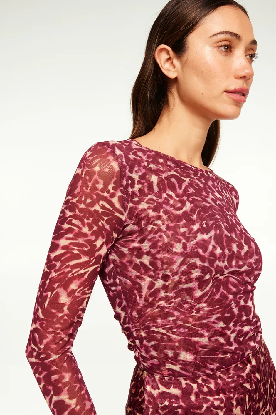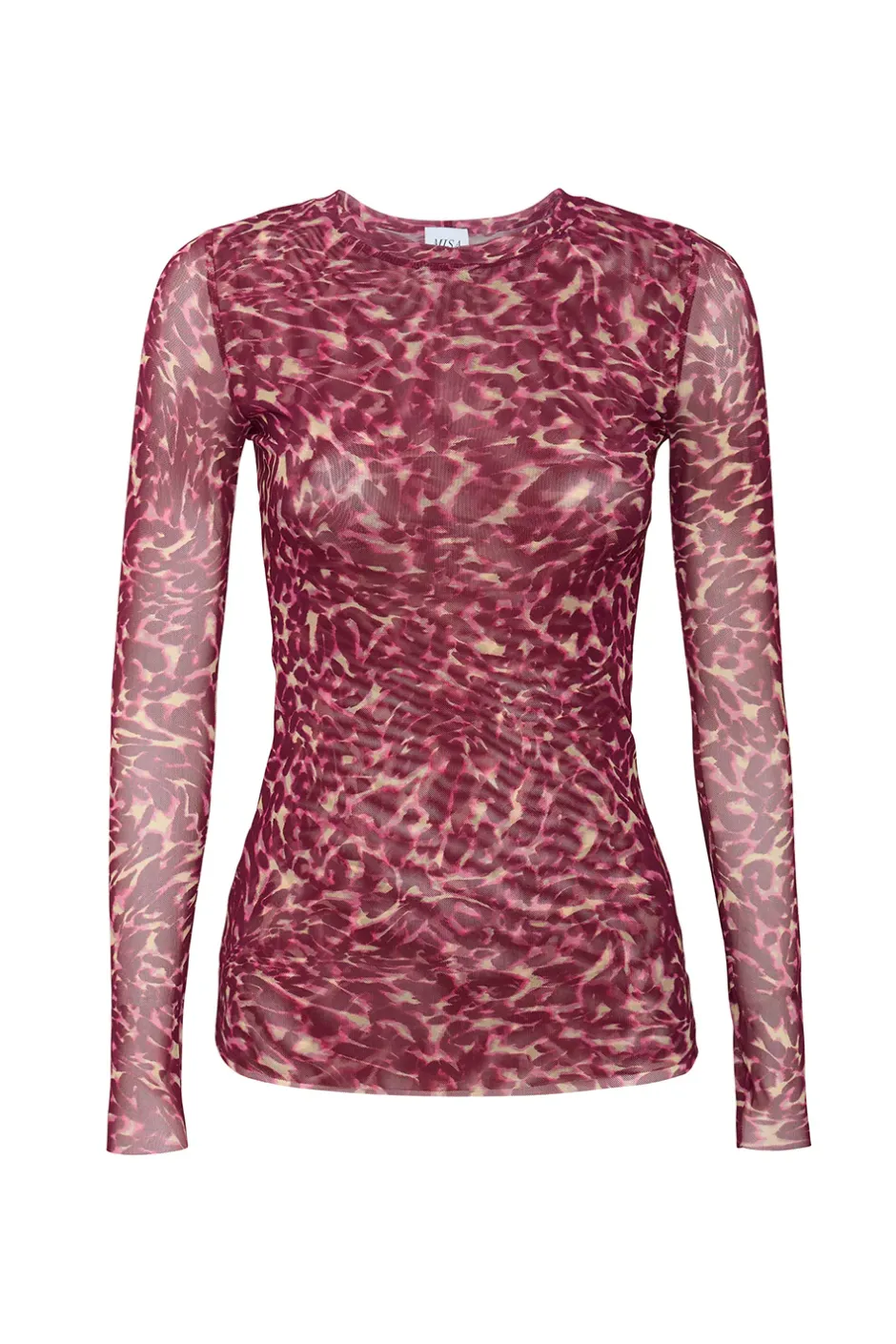 Our new Lula top is a long sleeve, fitted silhouette cut from an on-trend fuchsia leopard print mesh. The body is double lined and the sleeves are sheer. Crew neckline. Pair with the coordinating Ivan skirt for a standout set or with your favorite pair of jeans.