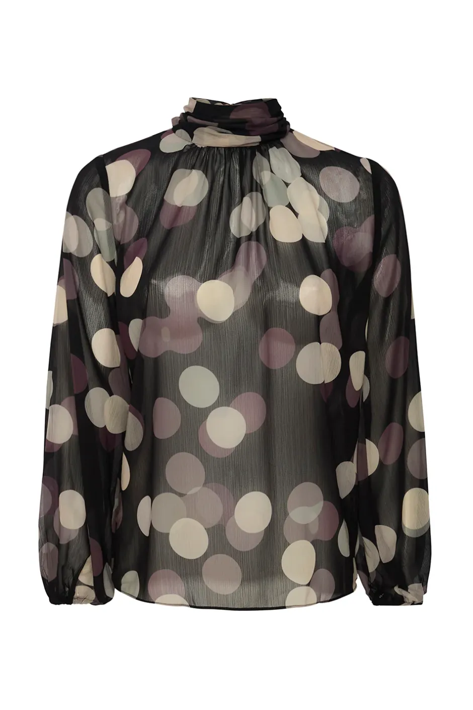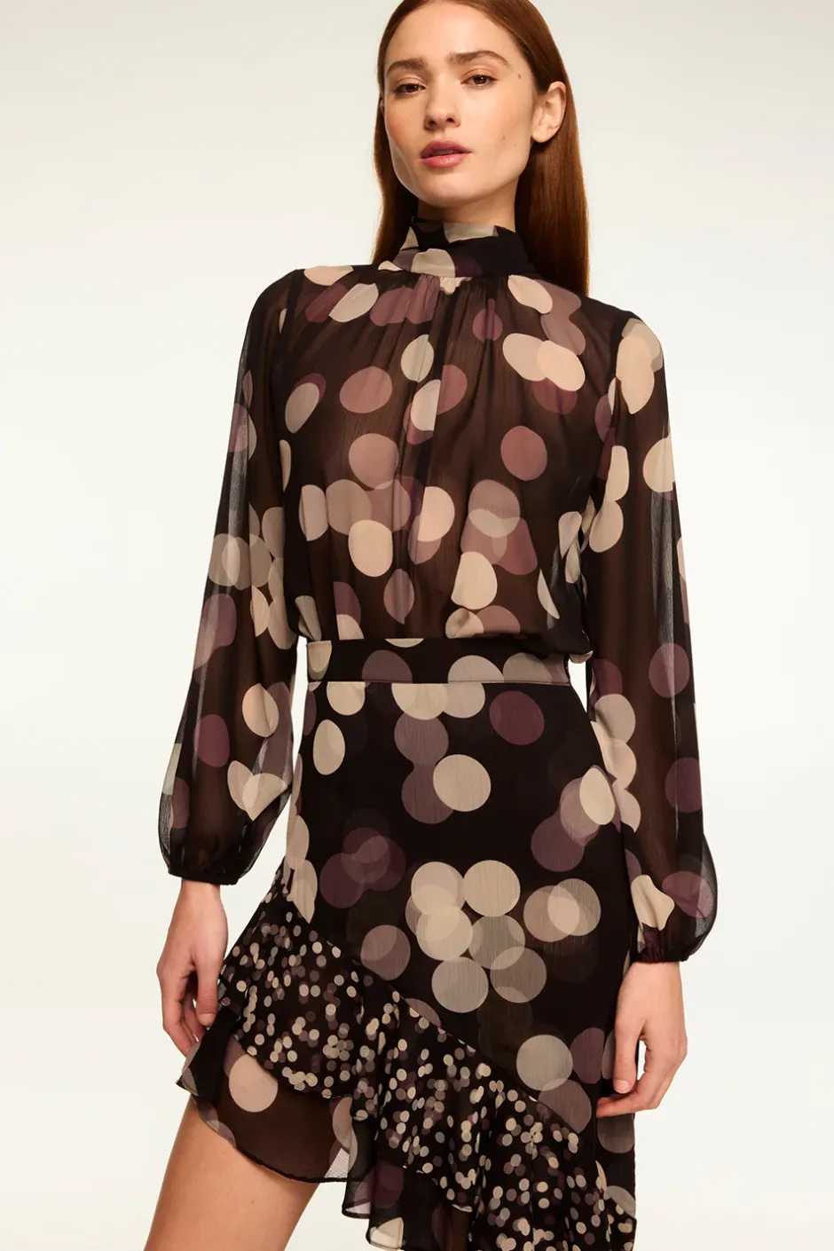 The Lulu top is a dreamy high neck silhouette cut from a chic polka dot print chiffon. The high neck is finished with a tie and hook closure. Long sleeves with elastic cuffs. Semi sheer. Pair with everything from denim to our coordinating Sky skirt for the perfect holiday set.