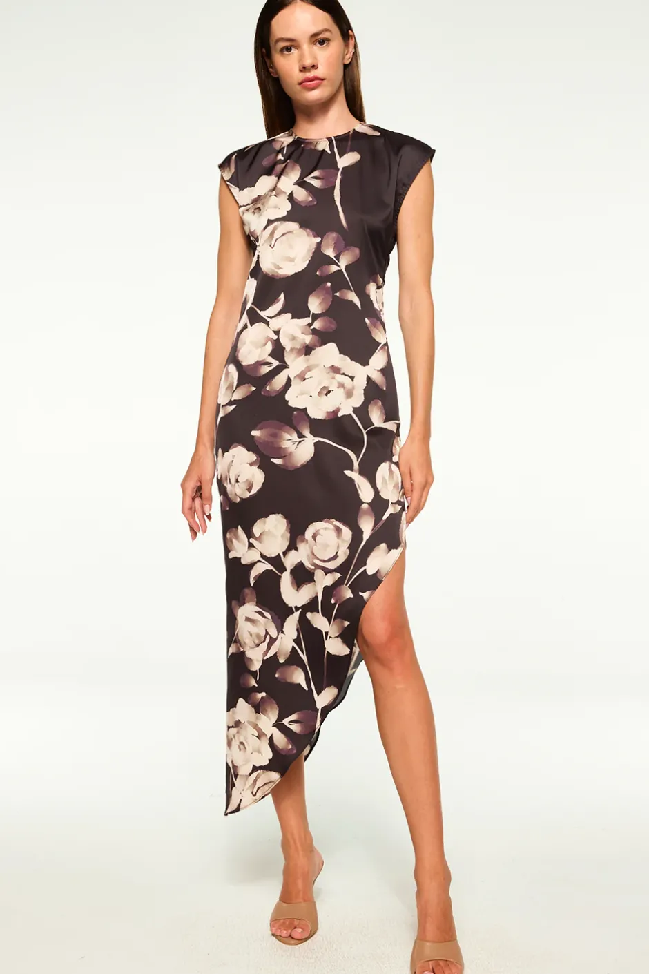 Lydia is a new modern silhouette in our gorgeous Faded Rose printed satin. Sleeveless with a high neckline and back button closure at the neck.Fitted through the bodice and hips. An asymmetrical skirt starts at the mini length and ends at a point just above the ankle. Pair with heels and top with a blazer for the perfect evening look.