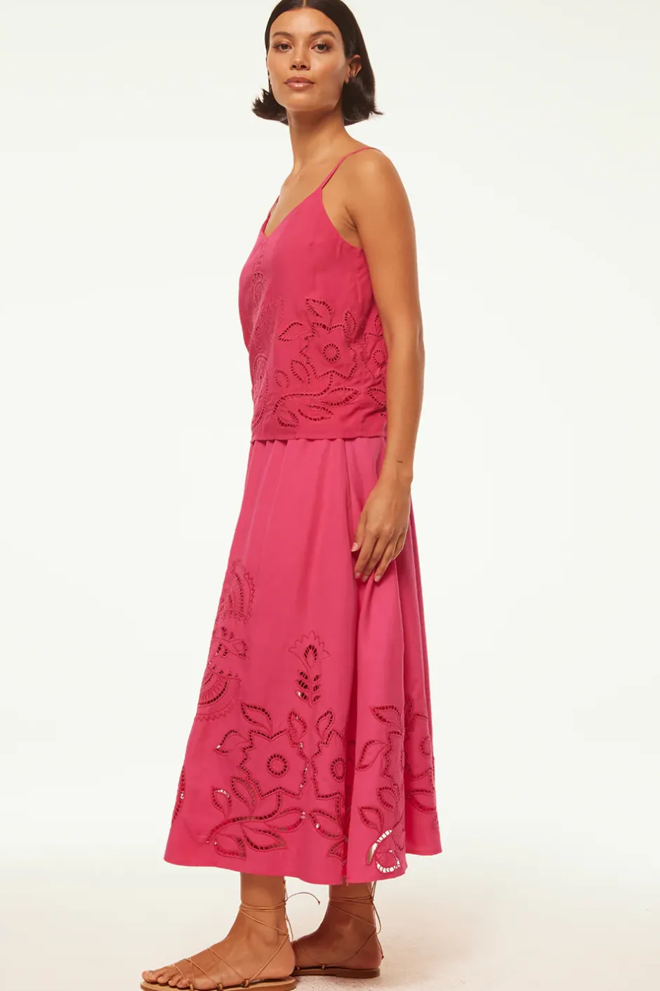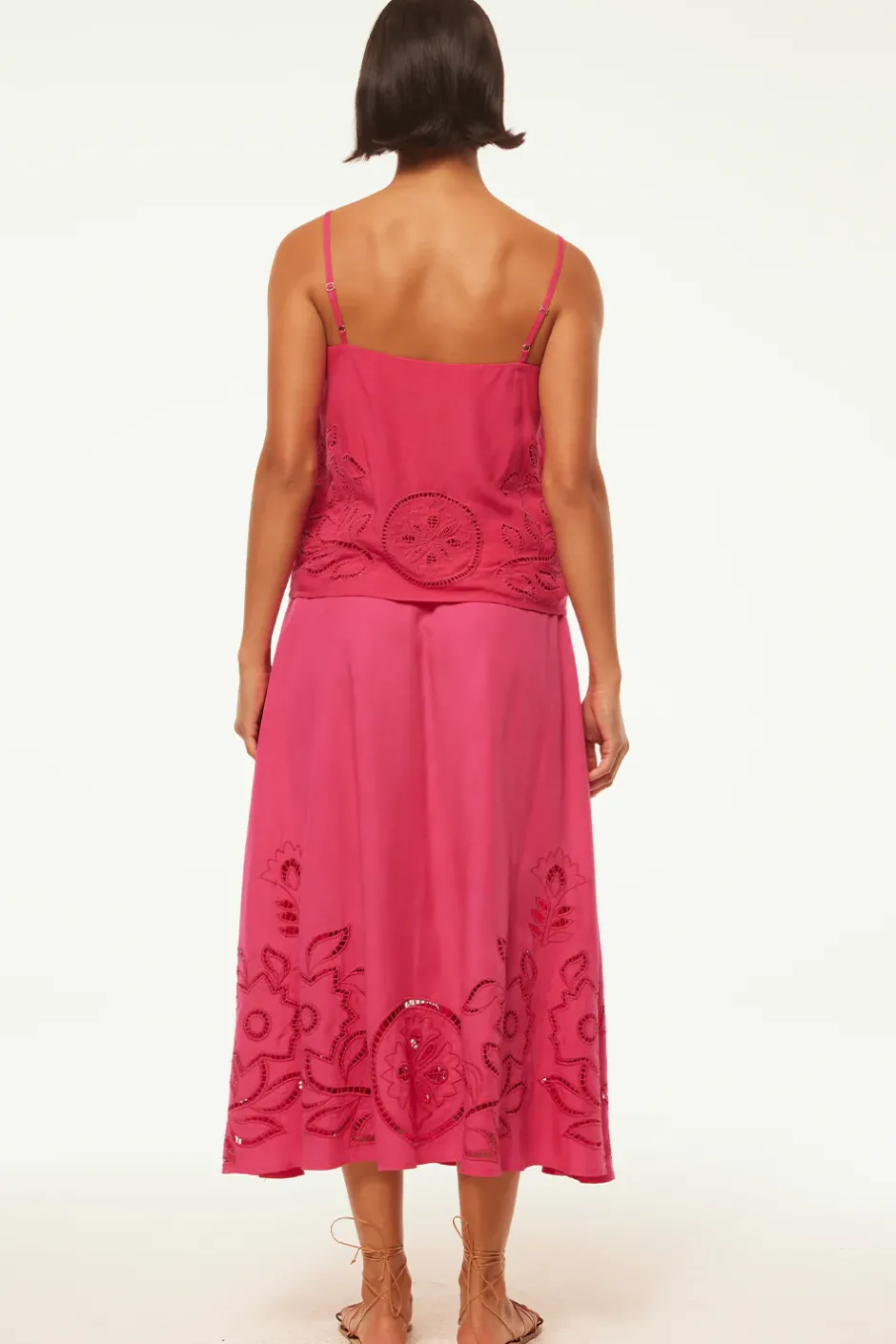 Marcela is an easy cotton camisole top in a vibrant pink hue. Featuring a gorgeous hand embroidered floral eyelet motif and adjustable spaghetti straps. Pair this piece with everything from denim to the coordinating Analisse skirt.