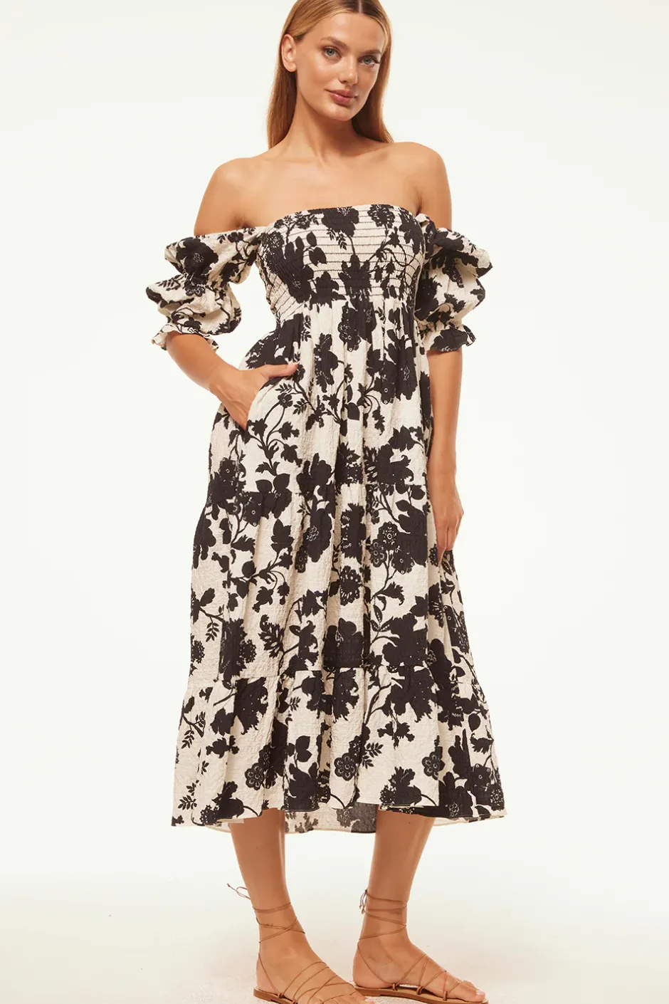 Our Margarita midi dress is a style you will turn to for seasons to come. Cut from a chic stretch crinkle cotton, this monochromatic floral print style can be worn on or off the shoulder. Featuring short tiered puff sleeves and a smocked bodice with tiered skirt and double side slit pockets. This flattering fit and flare silhouette can be dressed up with strappy heels or down with flats.