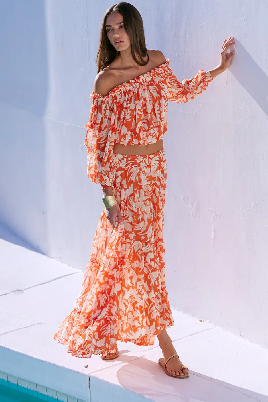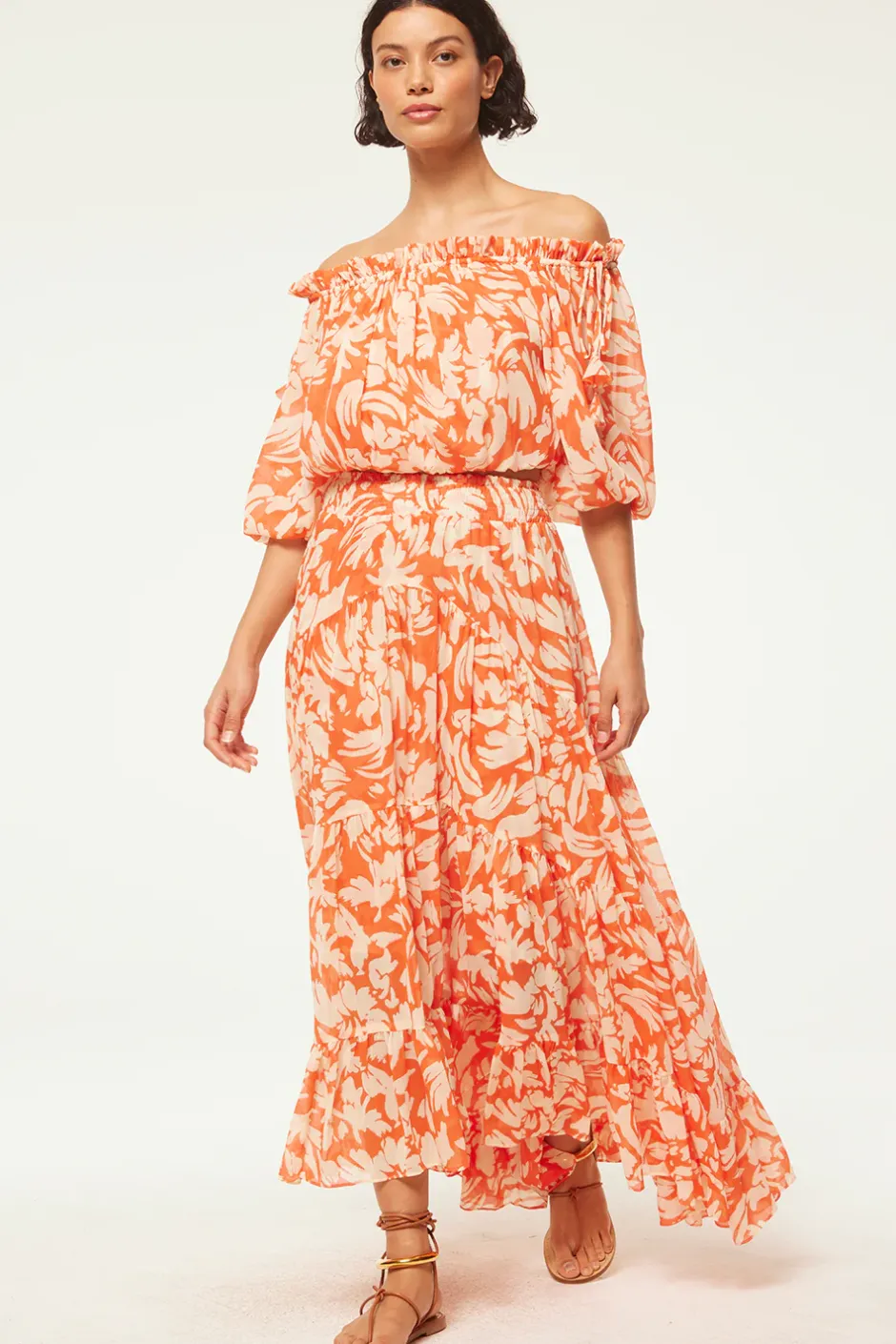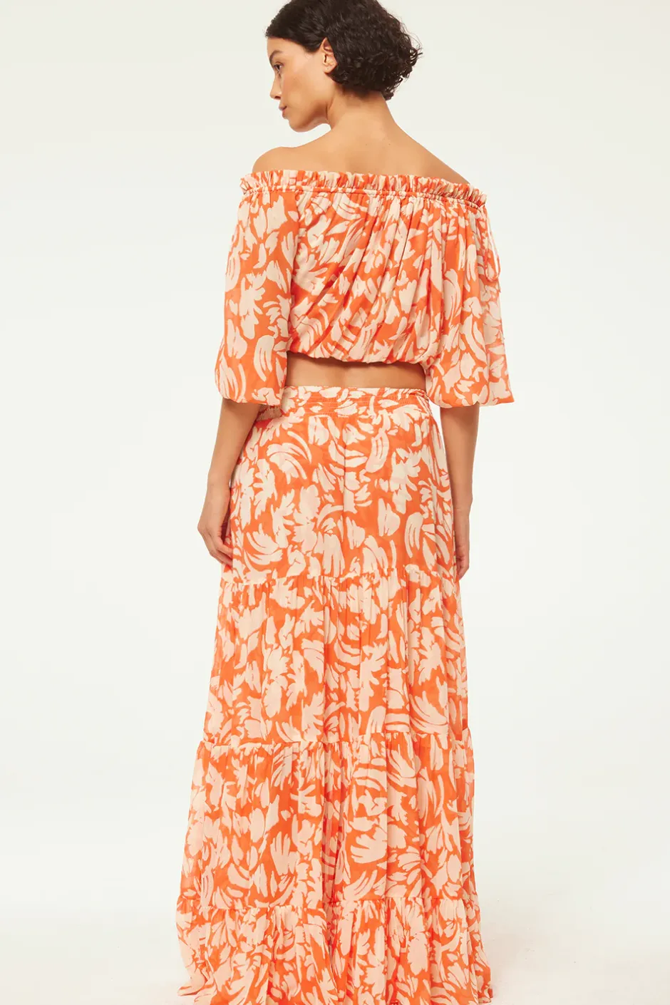 Handcrafted from airy Patmos Tangerine printed chiffon, the Marie skirt’s classic tiered silhouette is accented with an asymmetric hem. Featuring an elastic waistband and a double-lined slip skirt, this fresh, versatile piece makes for a perfect partner to the coordinating Eva top.