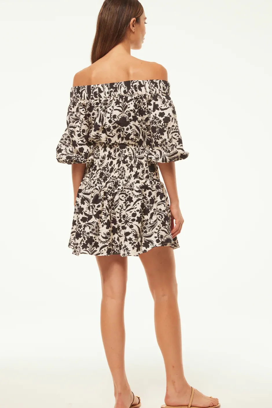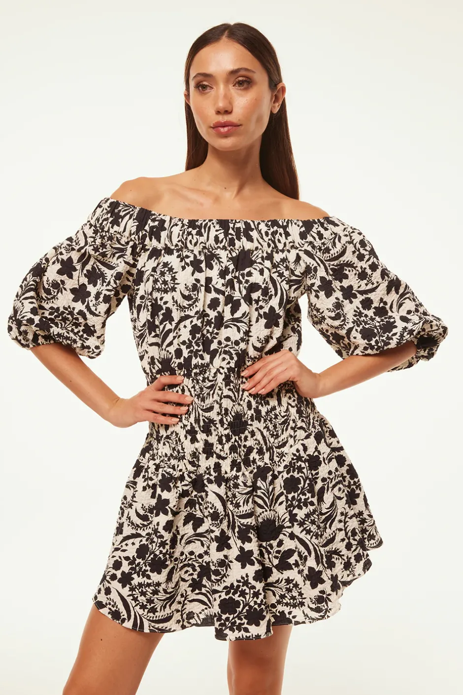 Marta is an update to a signature MISA mini style. Cut from a monochromatic ditsy floral print stretch crinkle cotton, this easy style features an off-the-shoulder neckline and blouson short sleeves. A blousy bodice leads into a wide, smocked waist and curved hem skirt. This timeless style will carry you through this season into the next.