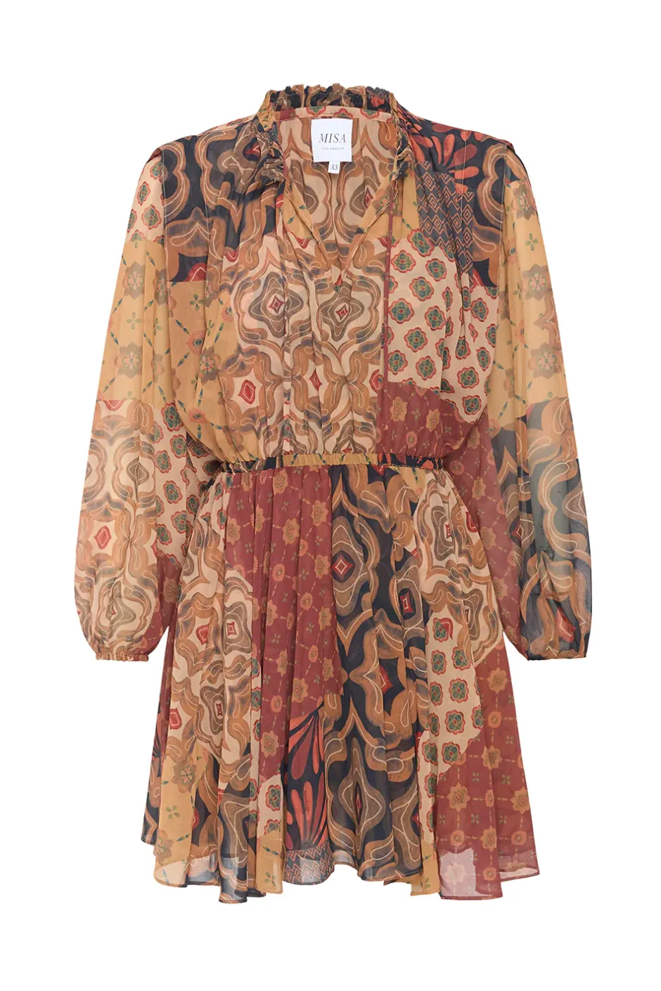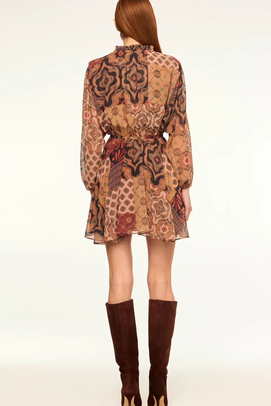 Our new Molly dress is cut from our new transitional Surreal Patchwork printed chiffon. A split neckline features a small ruffle detail and our signature petal tassel ties. Long blouson sleeves and elastic cuffs. An elasticized waist leads into a flowing, double lined skirt that hits above the knees. Embrace the changing seasons in this easy dress that pairs with everything from knee high boots to a strappy heel.