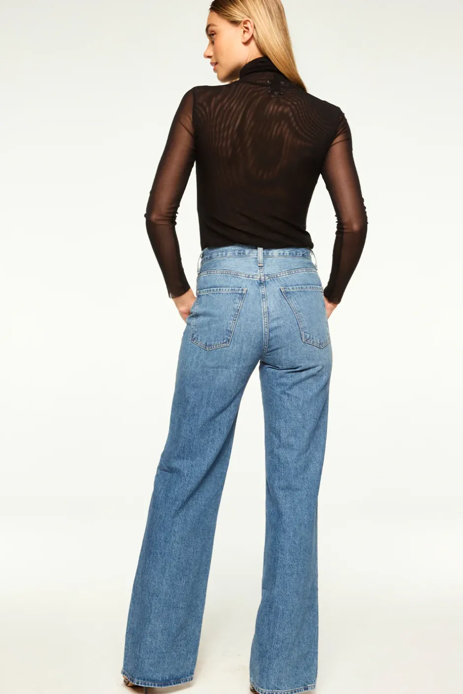 Our newest black mesh Nadja top is the perfect layering piece for fall and beyond. This fitted stretch turtleneck is double lined at the body and features long sheer sleeves. Sheer allover. Pair under our new Mariah dress or Cheryl dress or wear on its own with jeans.