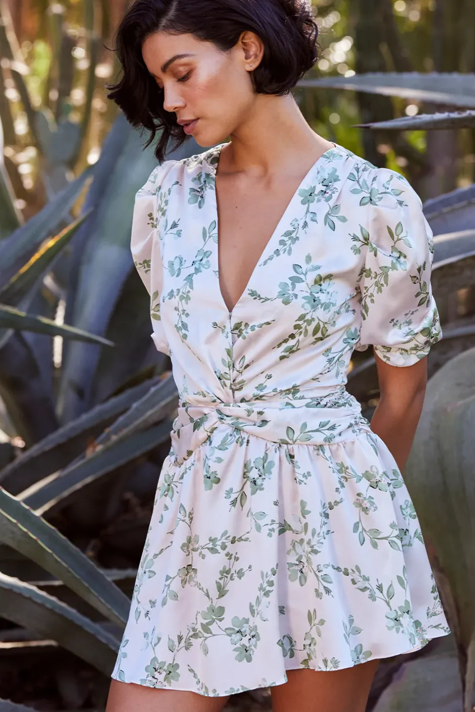 Our best-selling Narcissa is back for Spring in a beautiful sage botanica print on a warm ivory satin ground. This figure-flattering mini is perfect for day to date nights and all your special celebrations depending on what you style it with. Featuring a gathered waist, deep v neck with a snap closure, elbow-length puff sleeves, and a hidden back zipper closure.