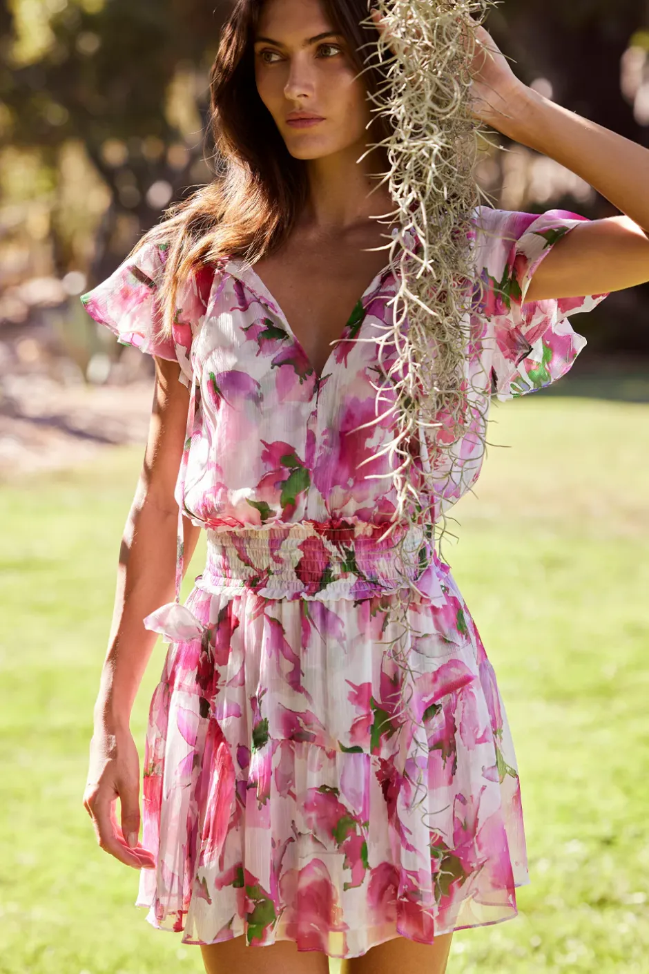 Natalia is an effortless mini silhouette cut from a romantic fuchsia floral print chiffon. A split v-neckline features a hook and eye closure with our adjustable petal ties. Short ruffle tiered sleeves. A smocked elastic waistband leads into a playful tiered mini skirt.