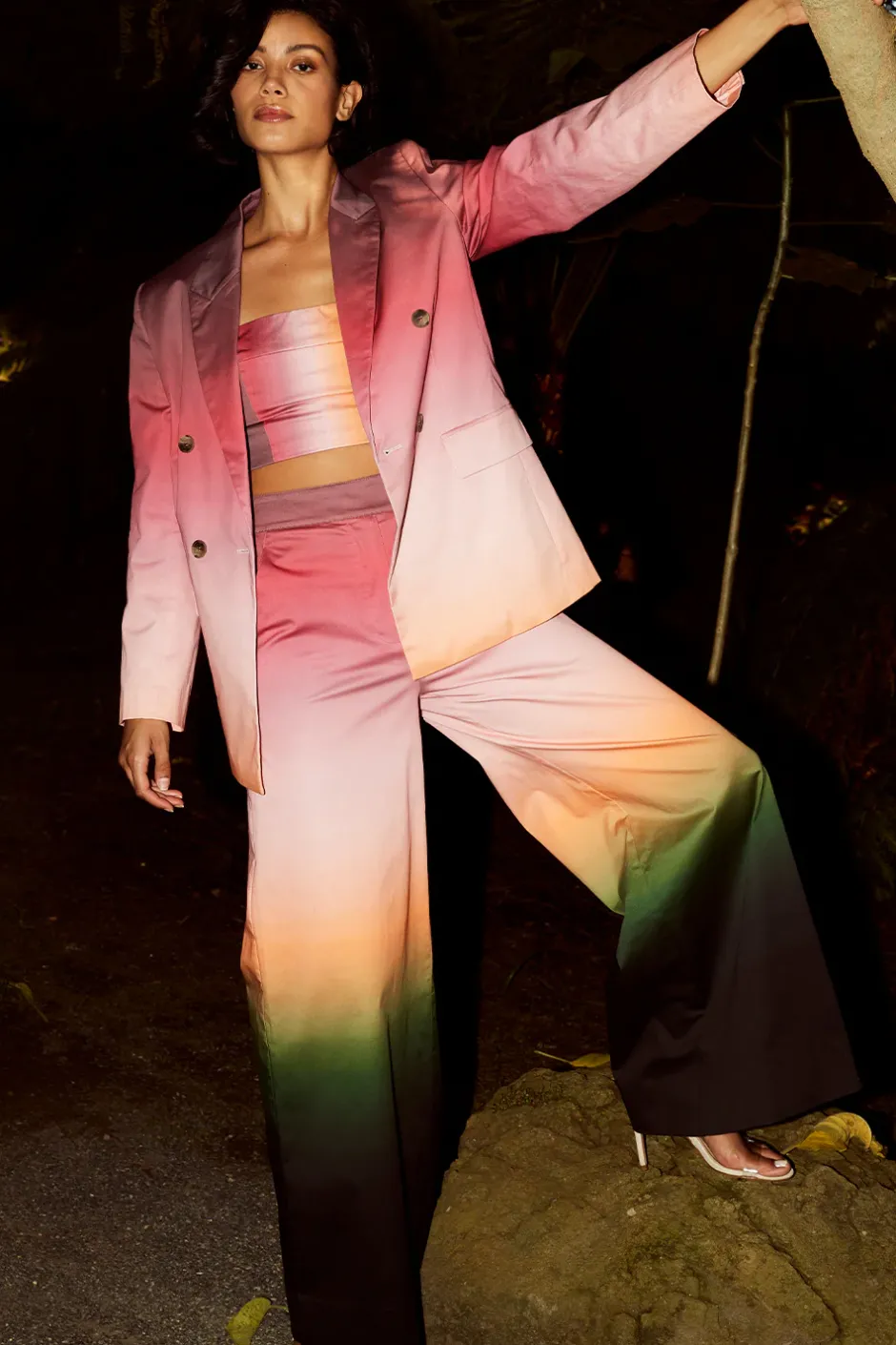 Our high-rise Nico pant is a standout look cut from a bold ombre print cotton. Featuring exaggerated wide legs and side slant pockets. A hidden zip front and extended hook-and-bar closure. Pair with the coordinating Candy bandeau and Viva blazer for a fun twist on suiting.