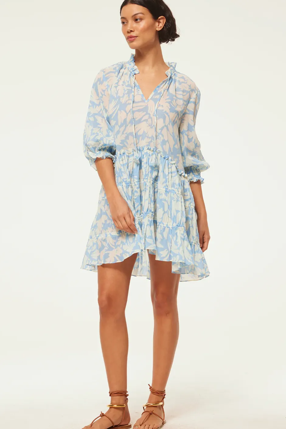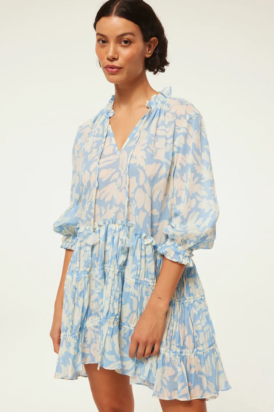 The Nita dress is the perfect effortless mini silhouette for this season and beyond. Handcrafted from a breezy Patmos Sky printed cotton, it features a split v-neckline with a delicate ruffle neck detail and our signature petal ties. Three-quarter sleeves are finished with ruffle-trimmed cuffs. This intentionally oversized weekday to getaway style is finished off with a ruched ruffle hem.