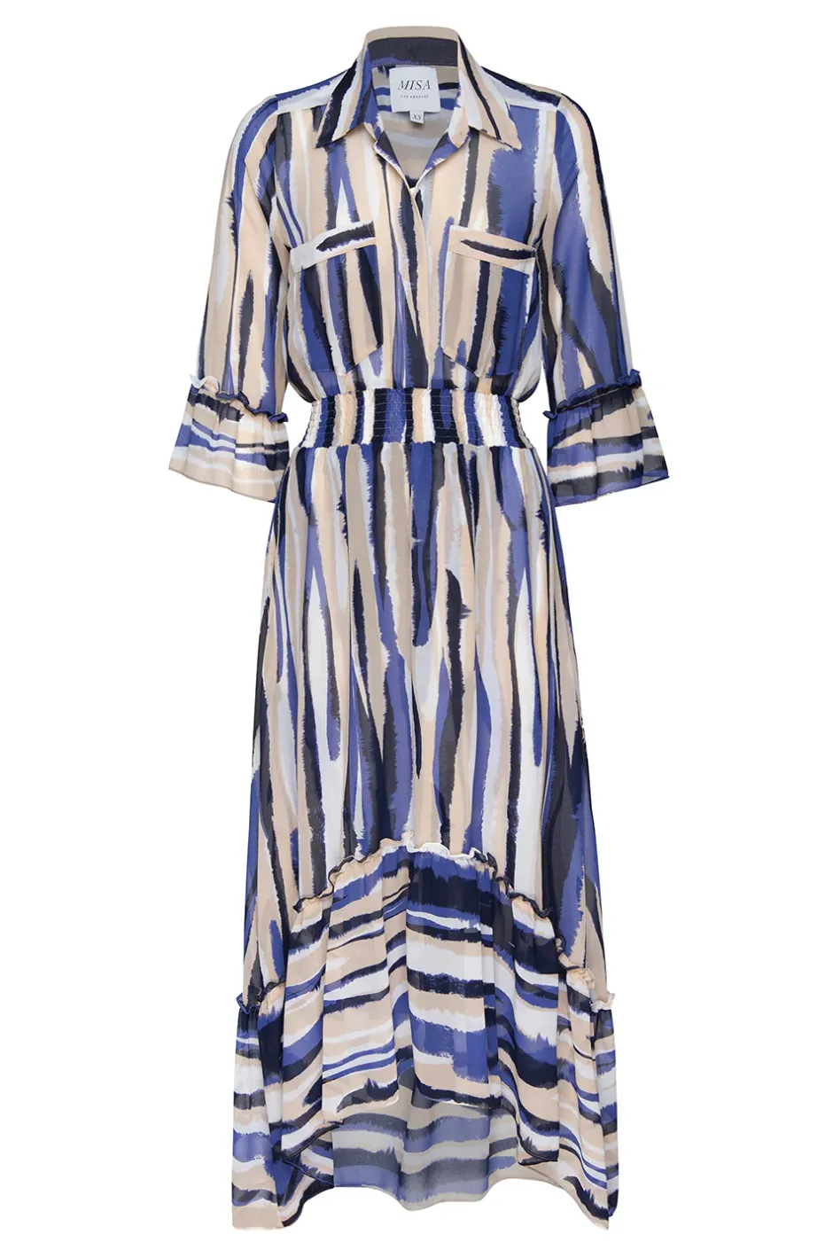 Our best-selling Ofelia midi shirt dress is back in a beautiful navy, blue and tan striped chiffon. This versatile silhouette elegantly transforms from daytime to evening. Featuring an elastic waistband, double pockets at the chest, and loose ruffles on the three-quarter sleeves and a-line skirt with wide ruffle hem.