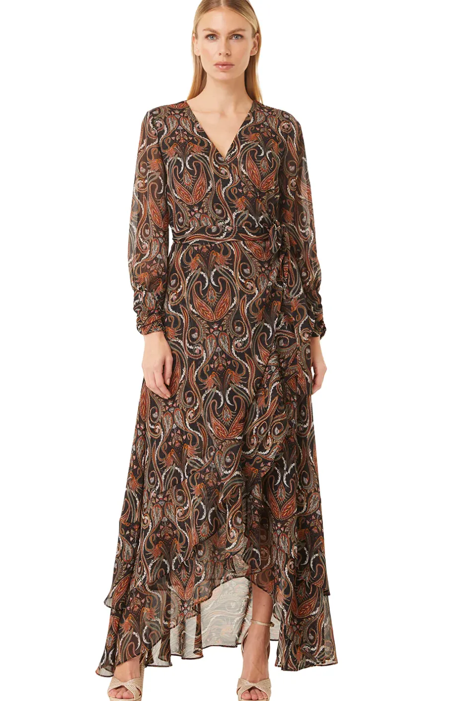 Pamela is a timeless maxi wrap dress cut from a gorgeous paisley chiffon with subtle lurex pinstripes. A surplice neckline with long sleeves and ruched cuffs. A side tie waist and flowing waterfall hem add a touch of romance to this feminine silhouette.