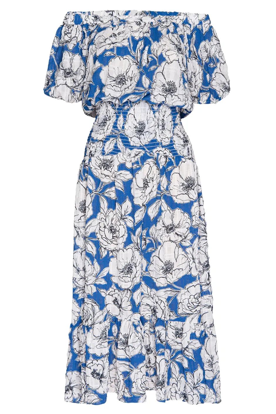 Paola is a chic off-the-shoulder midi in a gardenia floral crinkle fabrication. Defined by an elastic ruffle-trimmed neckline with an open back tie detail. A wide shirred elastic waistband leads into an asymmetric skirt with wide ruffle trim. A stunning style for every occasion this season and beyond…