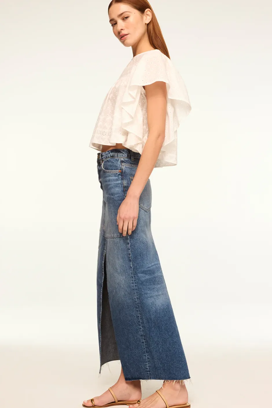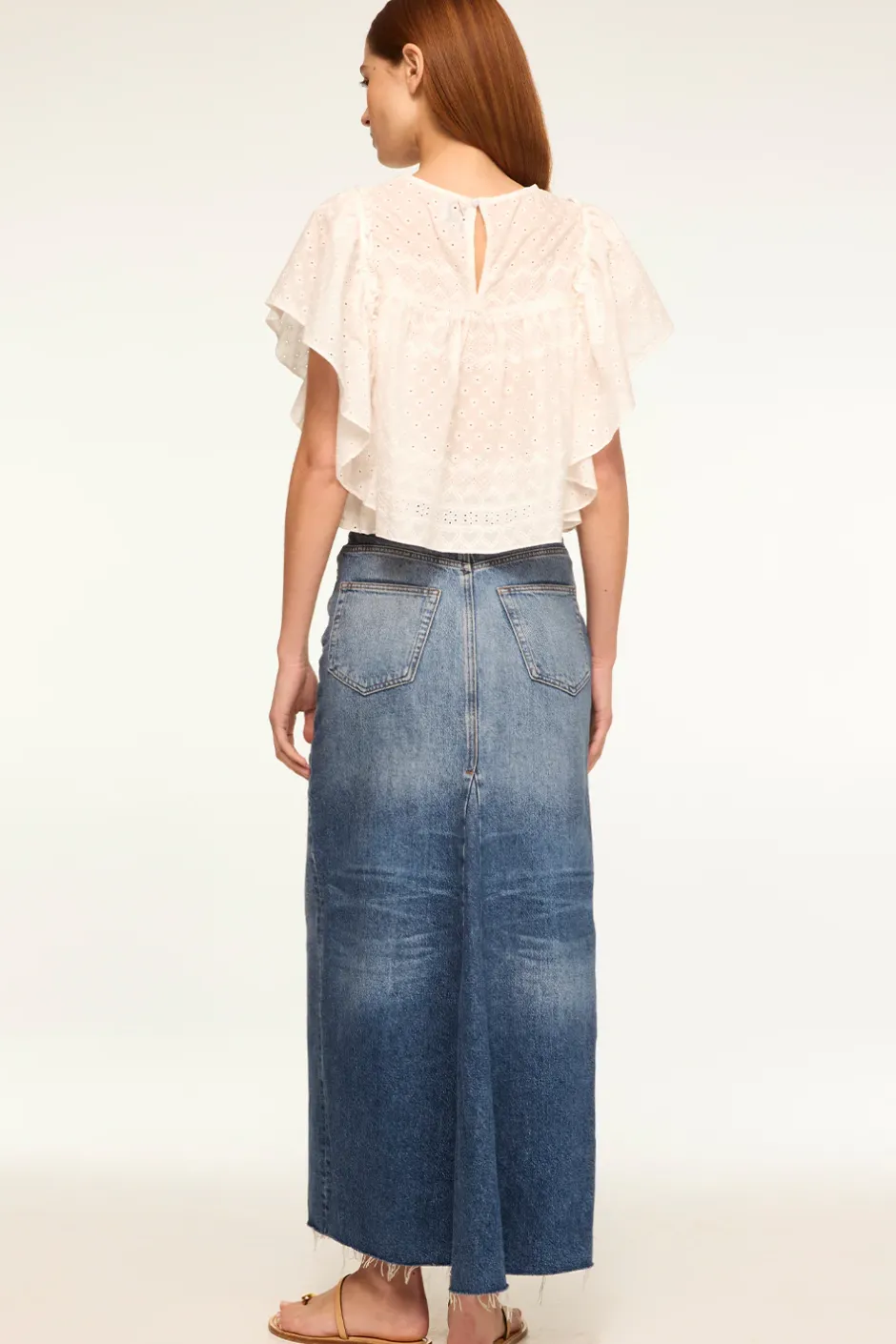 Penelope is an easy cropped blouse cut from a heart geo motif embroidered cotton eyelet. Featuring a high neckline and pleated above the bust. Short wide ruffle sleeves and a back hook closure finish off this easy style that will carry you through this season into the next.