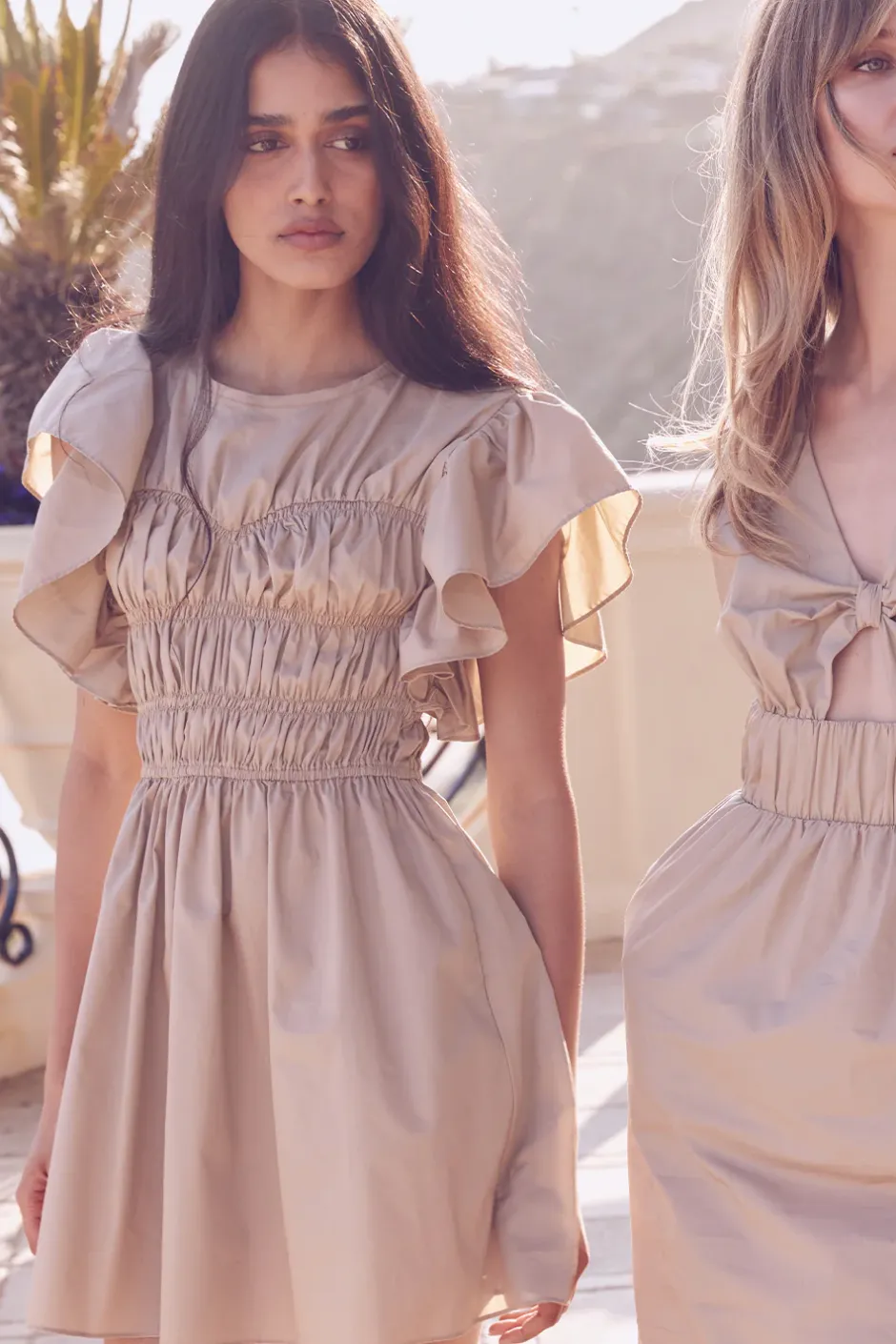 Our new Radha is an unforgettable cotton poplin mini dress. Featuring bold, short flutter sleeves, a high neckline with keyhole back button closure and ruched sweetheart bodice with flattering elastic smocking. The easy mini skirt features double side slit pockets.