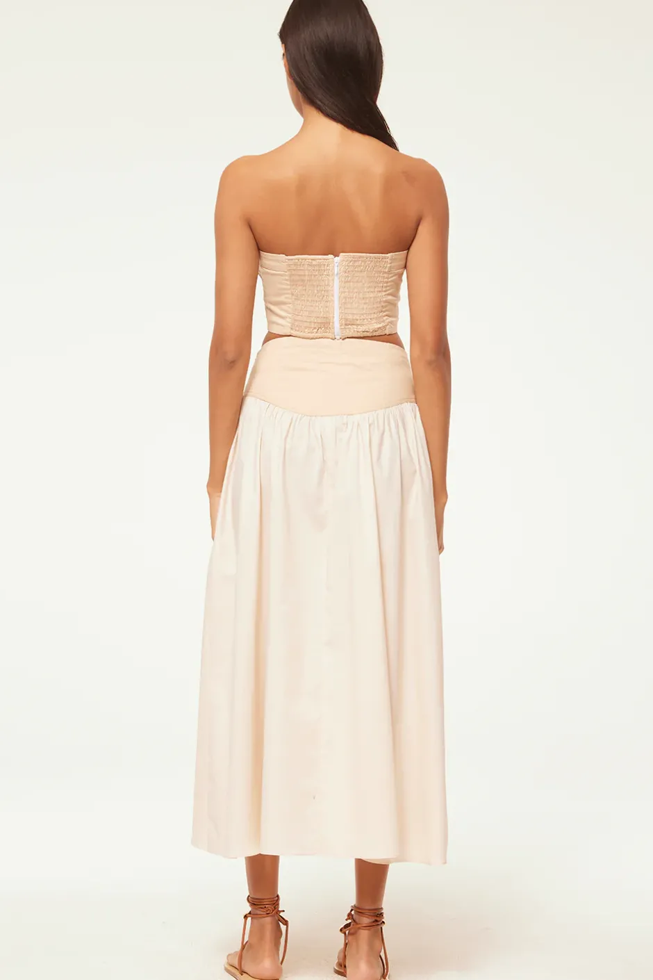 The Ramesh skirt is a midi length silhouette with a high-low hem, cut from a breezy cotton poplin in tonal beige and white. A curved wide banded waist offsets the flattering gathered skirt. Hidden side zip closure. Pair with the coordinating Golnaz bandeau for a chic summer set.