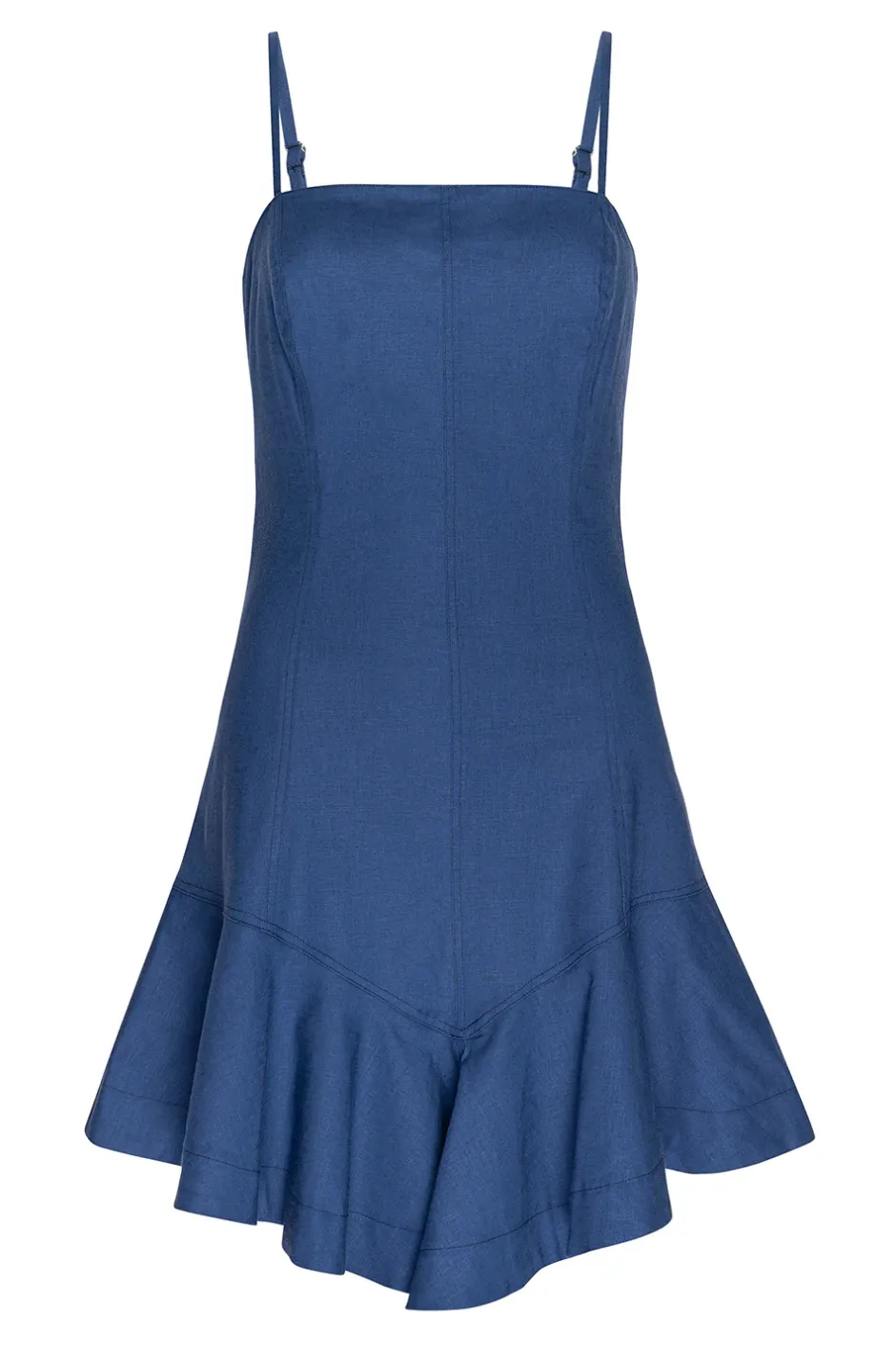 Our new Rita mini dress is a chic summer silhouette cut from a beautiful blue linen. A fitted bodice and skirt leads into a v-line skirt adorned with a wide ruffle trim. Sleeveless with adjustable spaghetti straps and hidden back zip closure.
