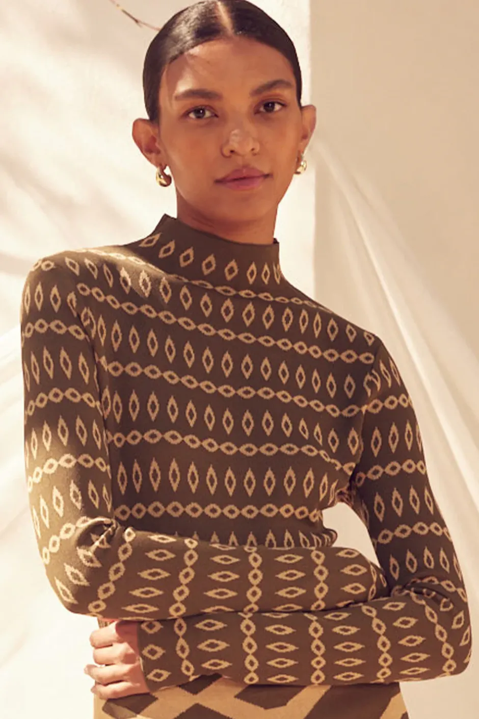 Our new River top is a rib knit jacquard fitted turtleneck in an Olive Geo print. Featuring long sleeves and a keyhole back button closure. Pair with jeans or the coordinating Milani skirt.