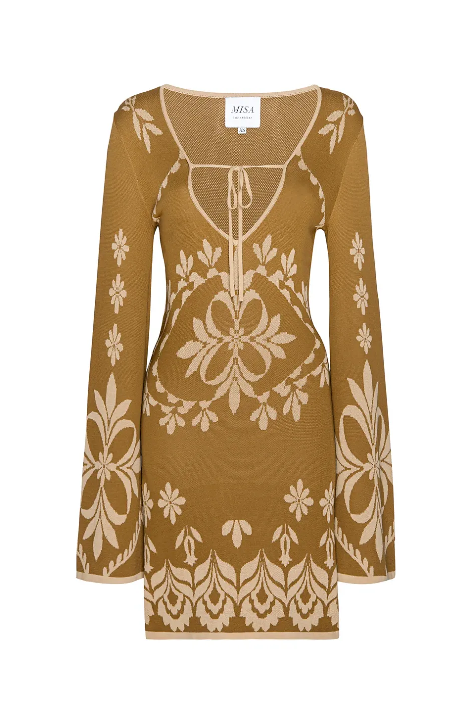 Our Sahar dress is a jacquard knit mini dress with a ivory floral motif on light brown ground. A scoop neckline features a keyhole bust with self-ties. Long flared sleeves. Pullover style. Pair with strappy sandals for an easy summer look.