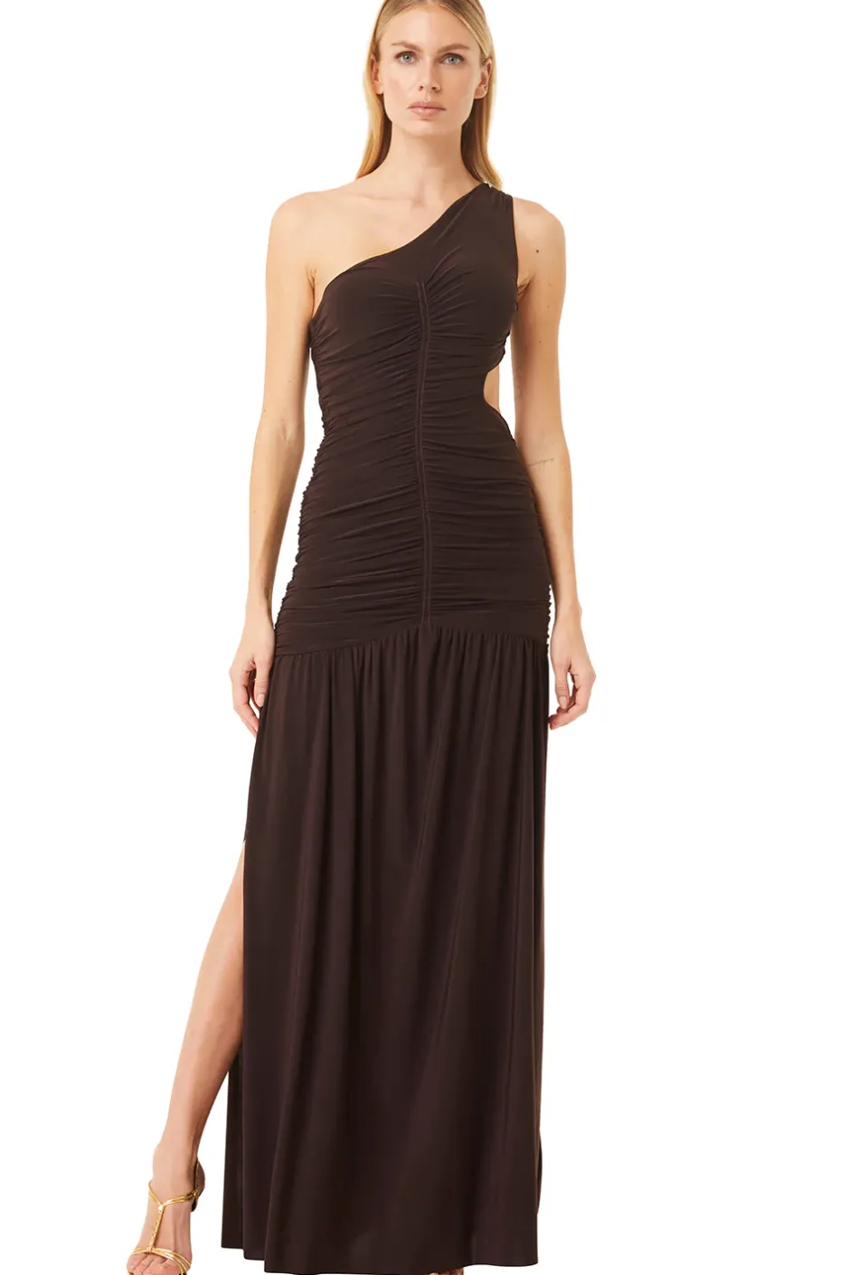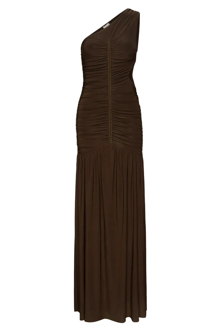 Samsara is our newest jersey silhouette in an on-trend espresso. Slipover style and maxi length. Featuring a ruched, cutout bodice and thigh-high side-slit, this one-shoulder silhouette is an easy option for every event on your holiday calendar.