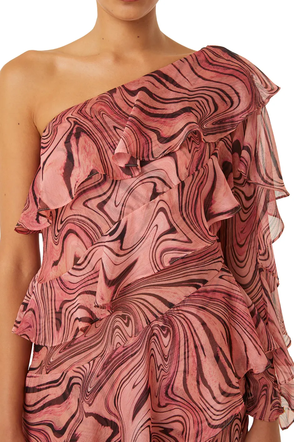 Cut from a beautiful dusty pink chiffon with a dark burgundy swirling woodgrain print, the Selena dress is a dreamy mini dress made up of airy tiered ruffles. This one shoulder silhouette leads into a long semi sheer sleeve with ruffle detail. The floaty skirt is made up of diagonally crossing ruffles for a beautiful effect. Pair this with a glittering heel for all your special moments.
