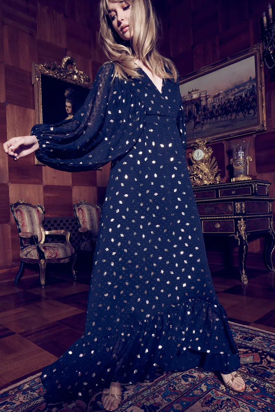 The Sigrid dress is the dreamiest maxi dress for this holiday season. Cut from a gorgeous black clip dot chiffon printed with metallic diamond dots. A deep v crossover neckline is finished with semi-sheer long dolman sleeves with slit bottom and an elasticized cuff. Pullover style with a covered elastic waist. This ankle grazing silhouette features a ruffle at the slightly high low hem. Pair with a strappy heel for your perfect holiday party look.