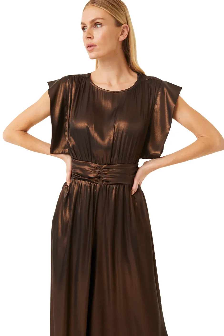 Be the life of the party in the Sophia jumpsuit cut from a bronze liquid metallic foil satin fabric. Stride into the night with a shimmering wide leg pant with side slit pockets. Waist ruching detail for a figure flattering fit. Hidden back zip detail. Complete with a platform heel for the ultimate 70’s chic look.
